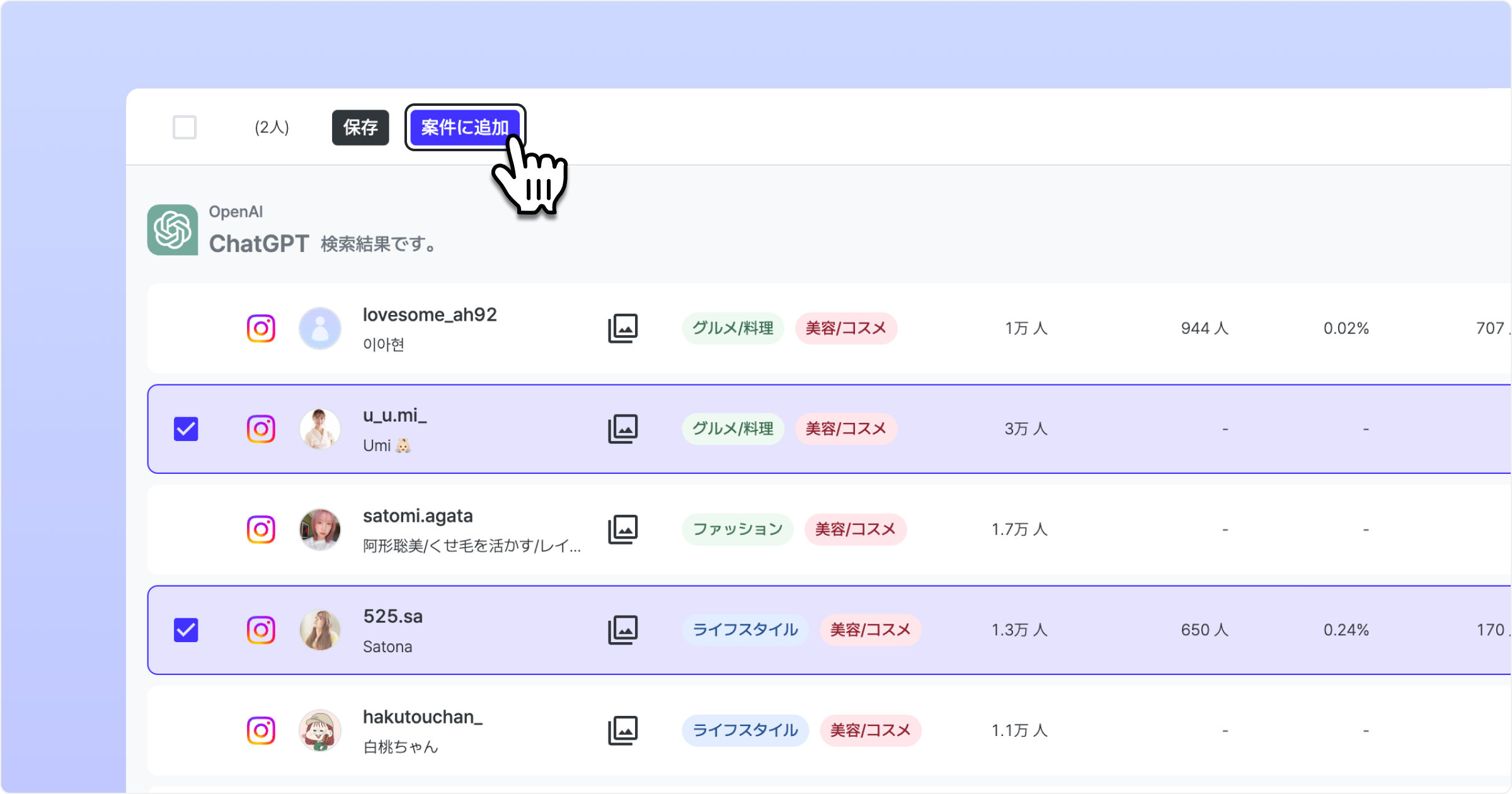 追加したいインフルエンサーのチェックボックスを選択します。