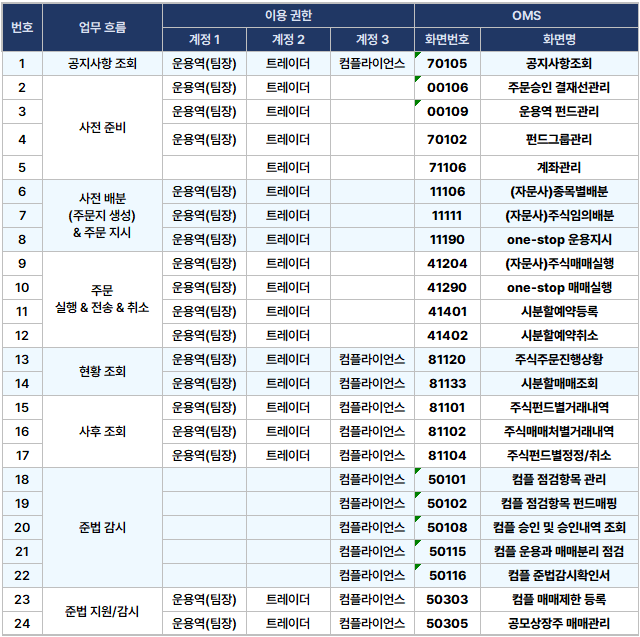 ※ 자문사의 경우, 운용역과 트레이더가 사용하는 화면은 대체적으로 동일한 편이나, 내부 기준에 의거 결재라인으로 권한을 설정하실 수 있습니다.