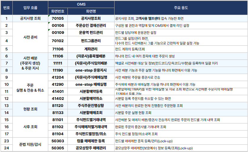 운용역(팀장 및 일반 운용역 포함) 이용자님들은 사전 준비부터 주문 지시/실행, 사후 조회, 준법 지원까지 모든 단계 걸쳐 핀케치 OMS를 이용하고 계십니다.