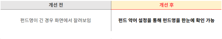 • 개선 목적 : 펀드명 약칭을 통해 주문 화면 내 펀드명 가독성 개선