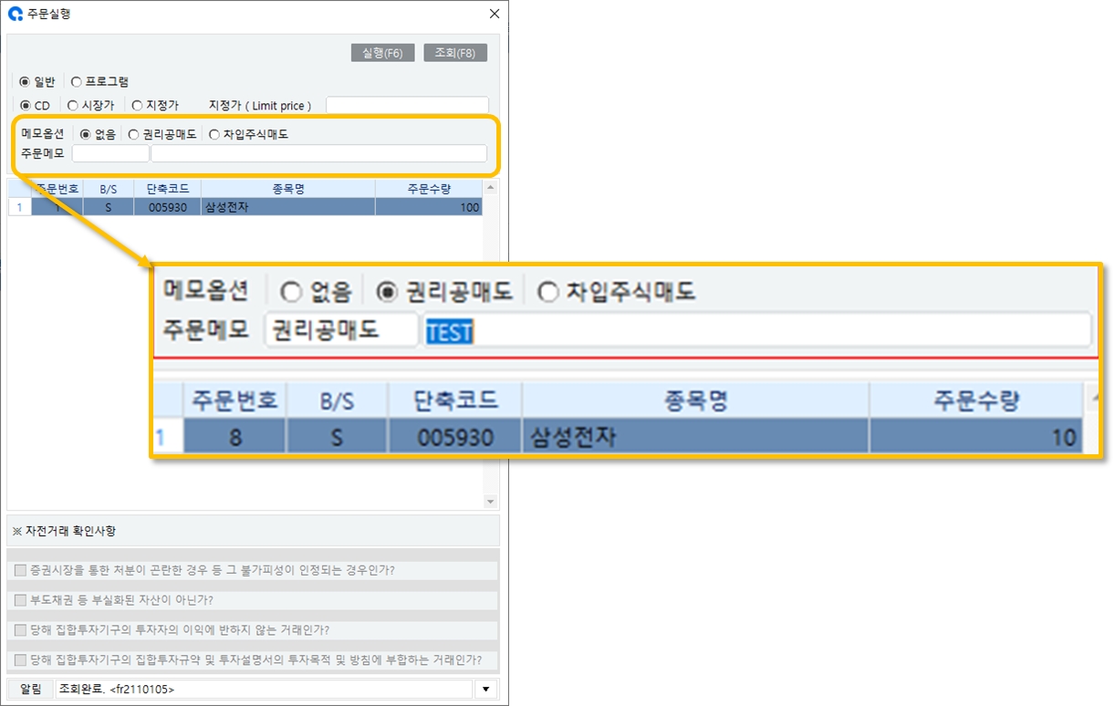 * [21101] 화면 : [주문실행] 클릭 > [주문실행] 팝업창에서 주문메모 옵션 등 정보 입력/선택 가능