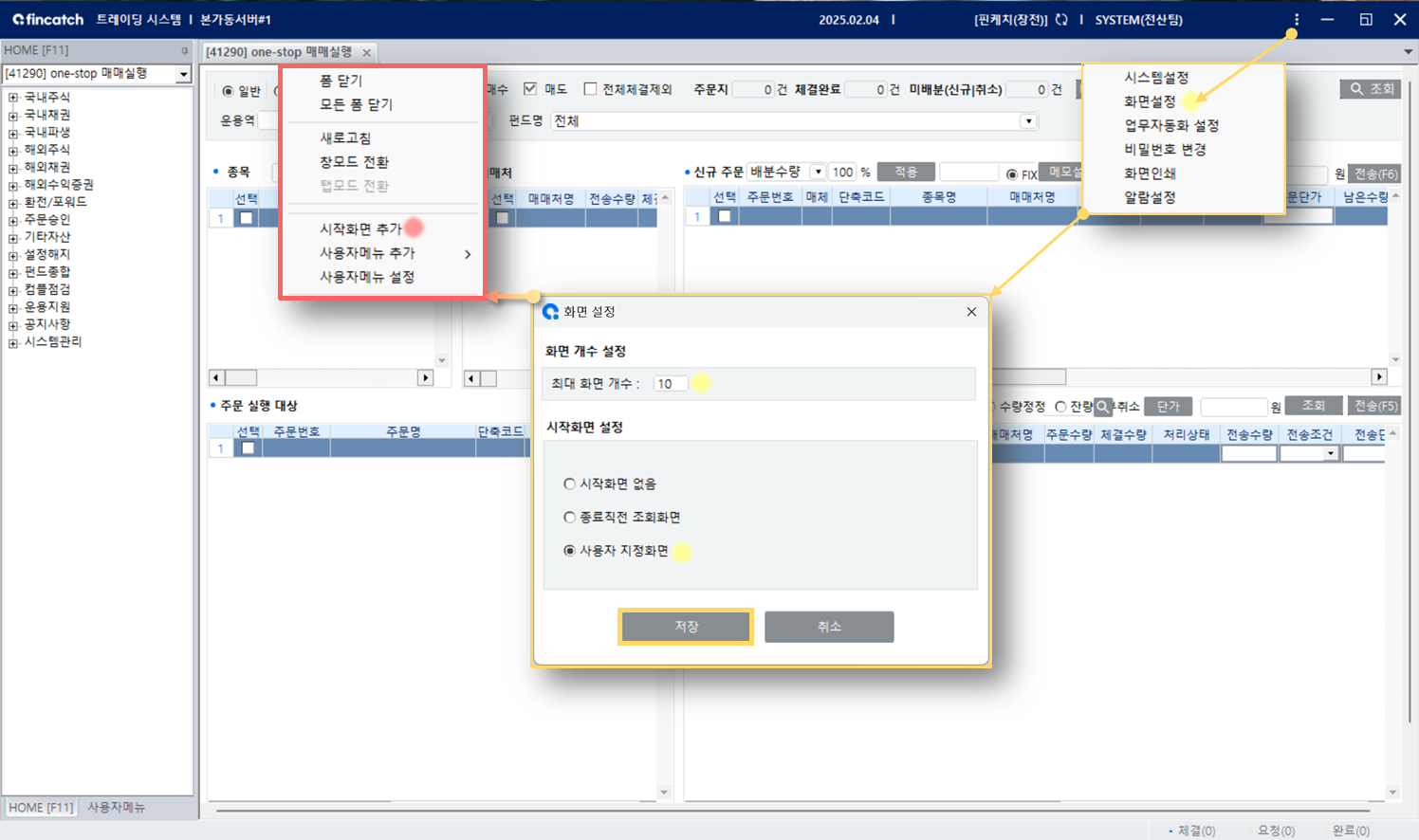 시작화면/최대 화면 개수 설정 : 로그인 후, OMS 창 우측 끝 부분의 설정 더 보기(세로점 3개) 클릭 > '화면설정' 선택 > [화면 설정] 팝업창에서 '최대 화면 개수' 입력, '시작화면 설정' 조건 선택 후 [저장] 클릭