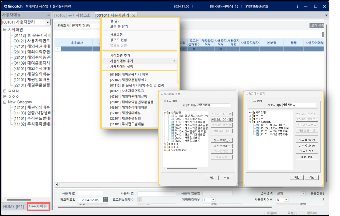 선택창의 [사용자메뉴 설정] 선택 > [사용자메뉴 설정] 팝업창에서 카테고리 추가/삭제/변경
