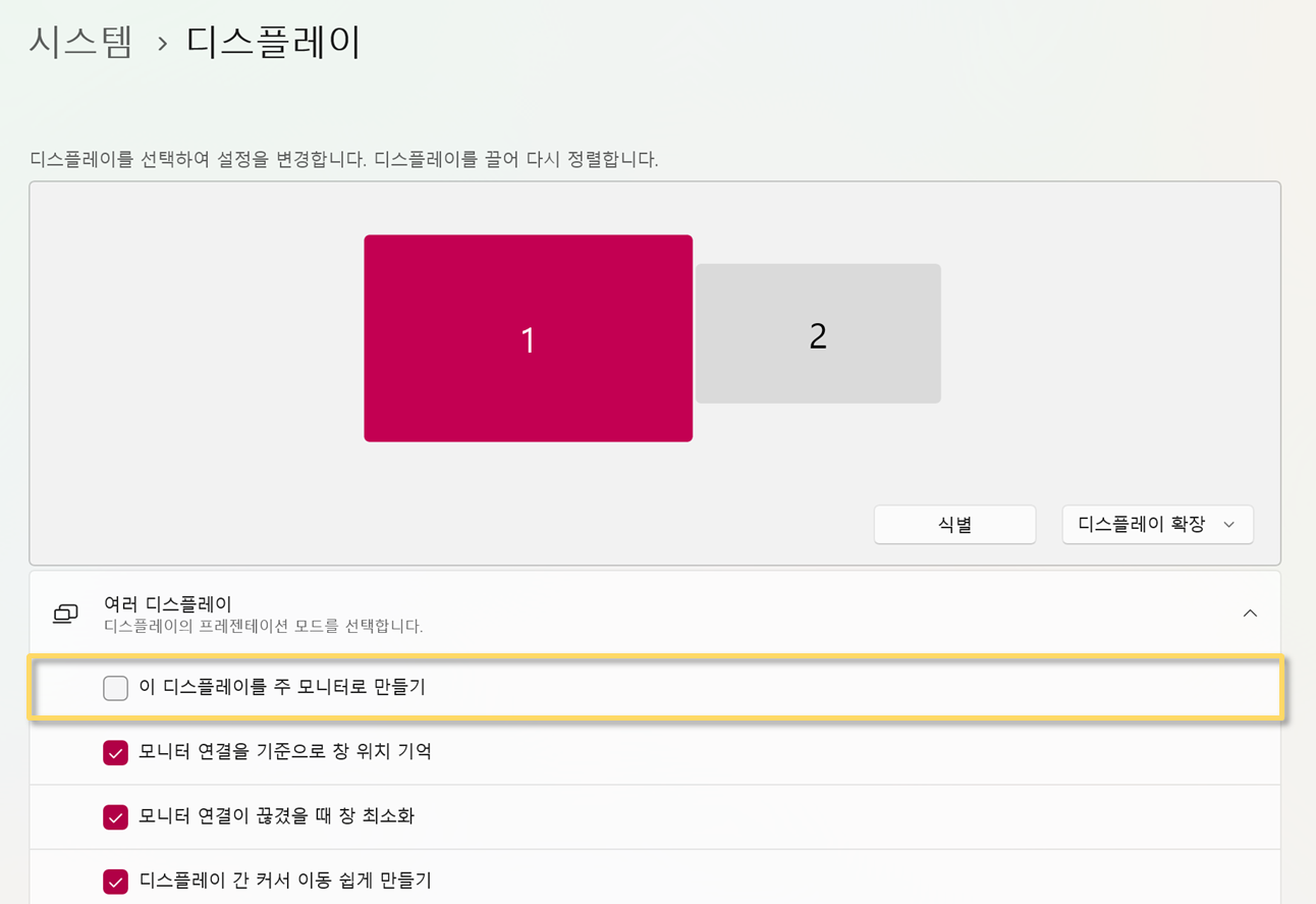 ※ 단, 이 방법은 2개 이상의 모니터를 연결/사용중인 환경에서만 설정하실 수 있습니다.