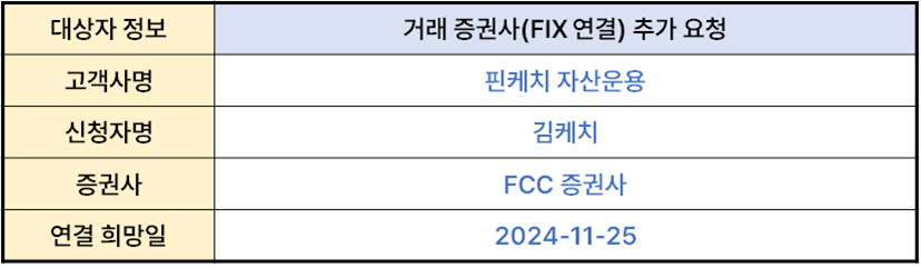 핀케치 고객지원으로 FIX 연결 증권사 추가를 신청을 접수 합니다.