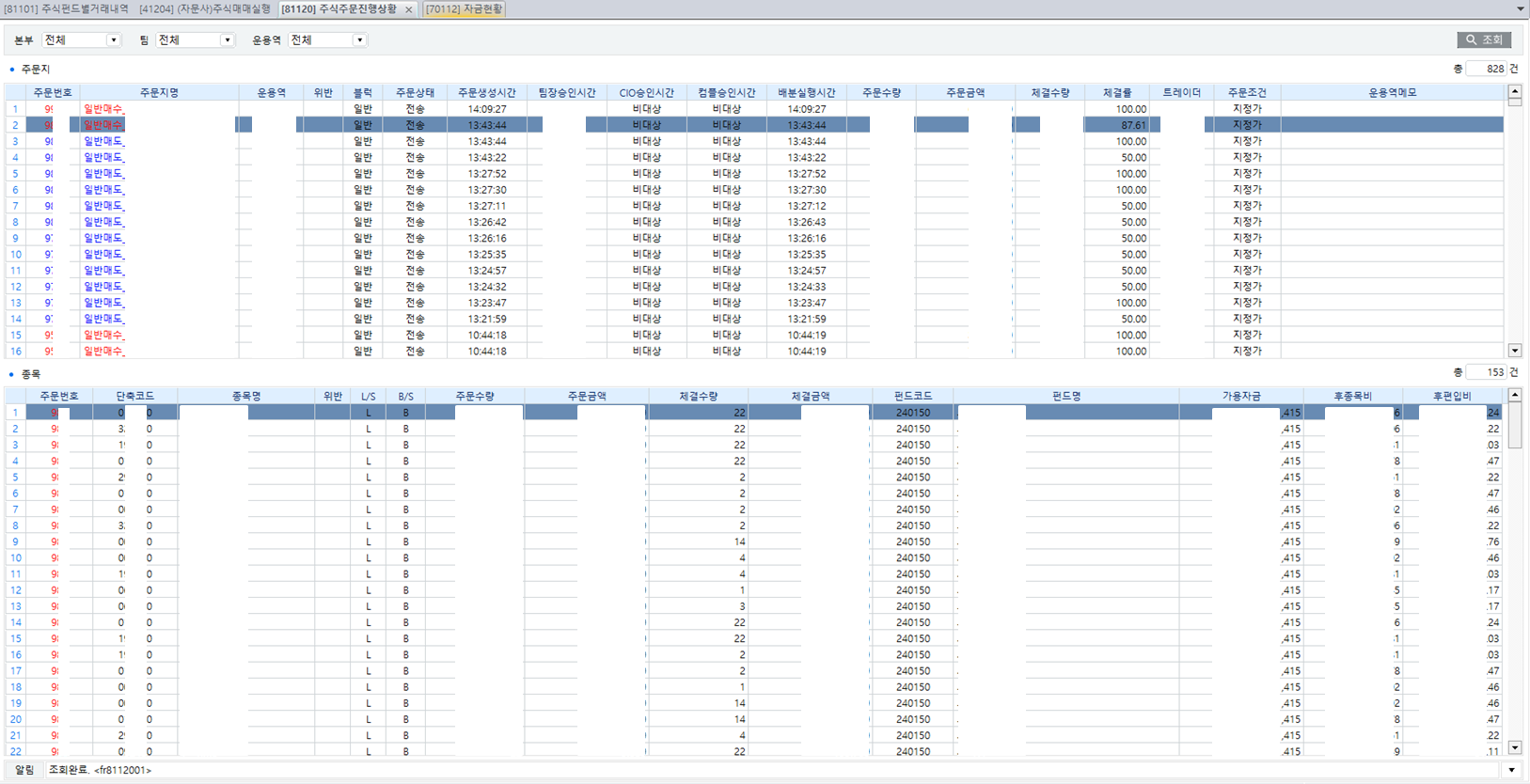 주문번호 | 단축코드 | 종목명 | 위반 | L/S | B/S | 주문수량 | 주문금액 | 체결수량 | 체결금액 | 펀드코드 | 펀드명 | 가용자금 | 후종목비 | 후편입비 |