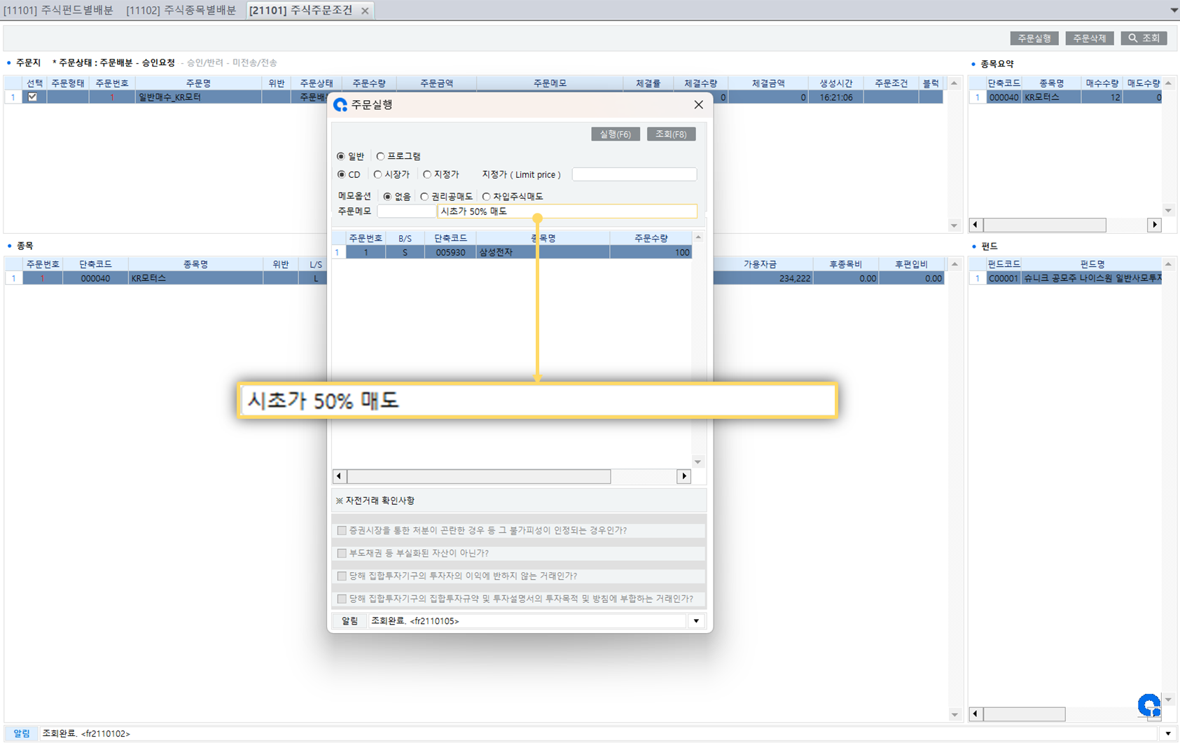 주문 메모 : 시초가 주문 희망 조건 기입 (EX;시초가 50% 매도)