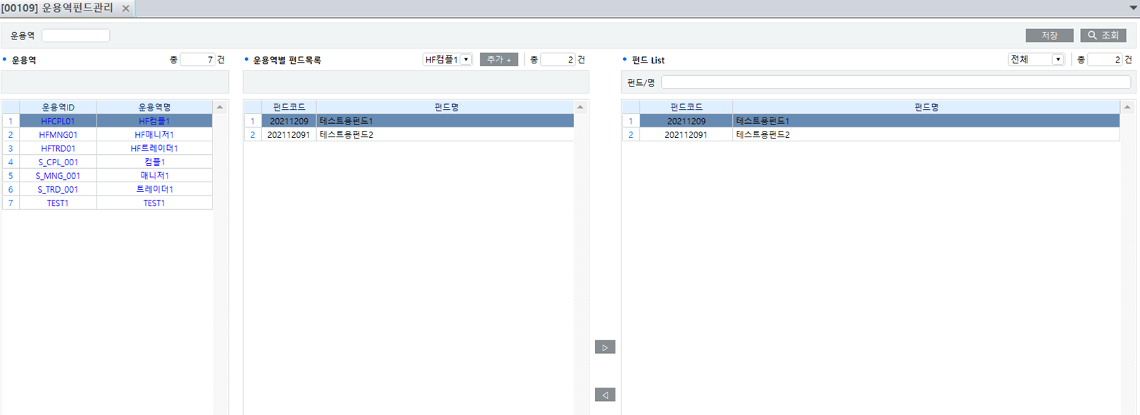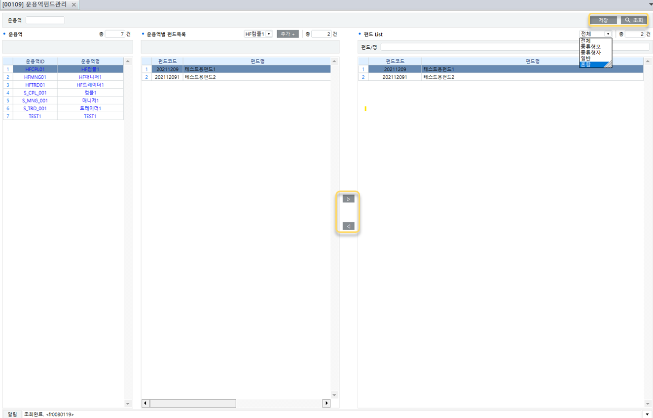 펀드권한 부여하기 : 우측 펀드 List 탭에서 펀드 선택 > (좌측향 화살표) 클릭