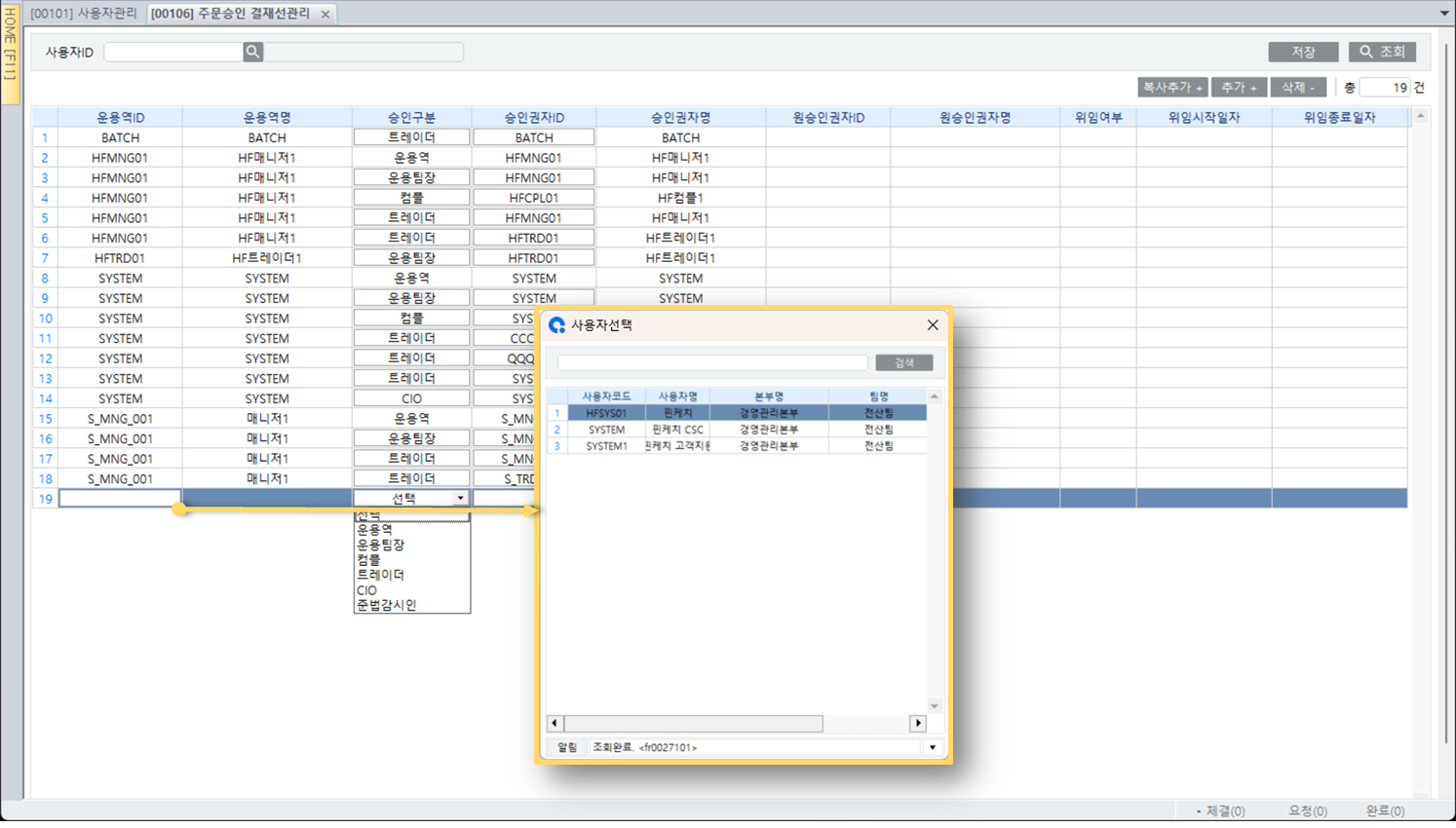 경로 : 주문승인 > 주문승인 > [00106] 주문승인 결재선관리