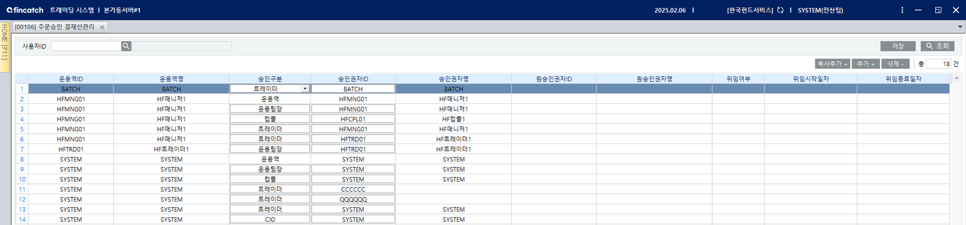 내 주문을 처리 할 트레이더 또는 내 업무를 결재 할 전결권자를 1번과 동일한 방식으로 검색/선택하여 |승인구분|승인권자 ID|승인권자명|에 등록 합니다.