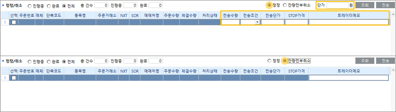 ※ 전송수량, 전송조건, 단가, STOP가격, 메모의 경우 개별 입력하여 정정이 가능합니다.