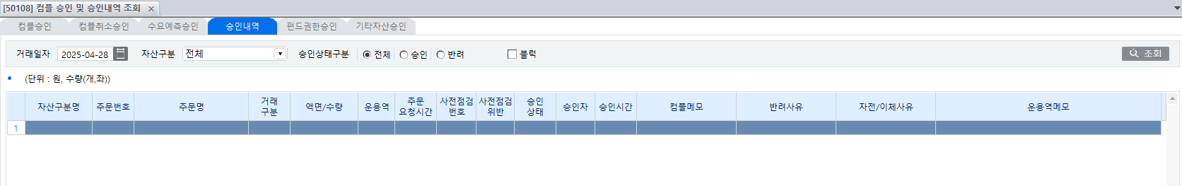 컴플라이언스 점검에 위반되어 승인을 요청한 내역과 승인/반려 내역을 조회할 수 있습니다. 거래일자, 자산구분, 승인상태구분으로 필터링하여 확인 가능한 점 참고해 주세요!