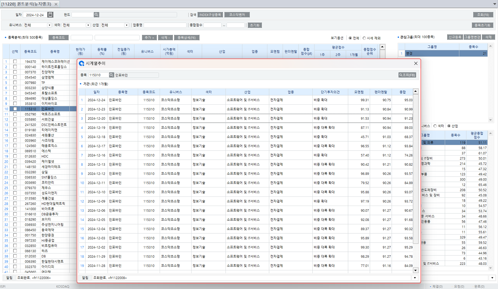 펀드 및 유니버스/섹터/산업/업종/종합점수/INDEX구성종목/코스닥벤처 해당 여.부 등 조회가 가능하며, 좌측 관심그룹 탭에서 관심 종목을 관심 그룹으로 설정/확인하실 수 있습니다.