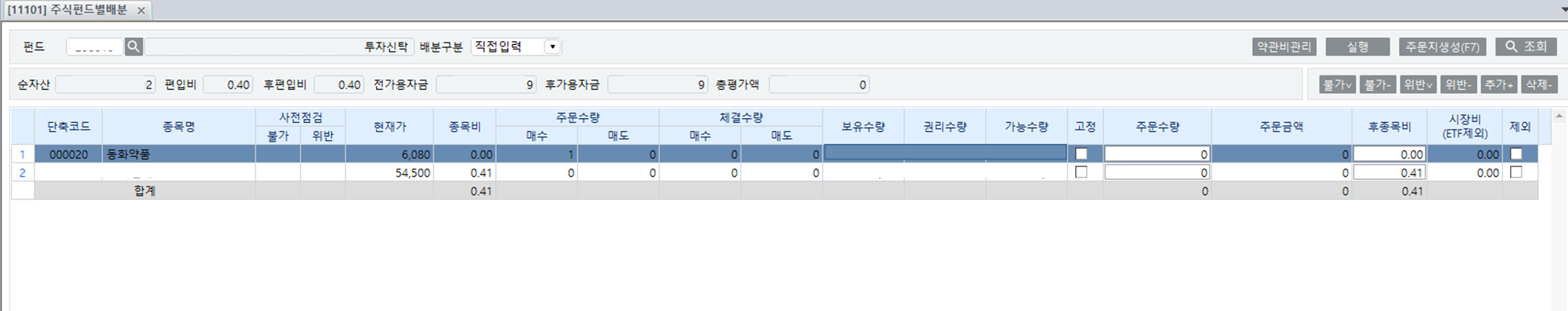 하나의 펀드 기준으로 주문지 생성(사전 배분)하는 방법은 아래와 같습니다.