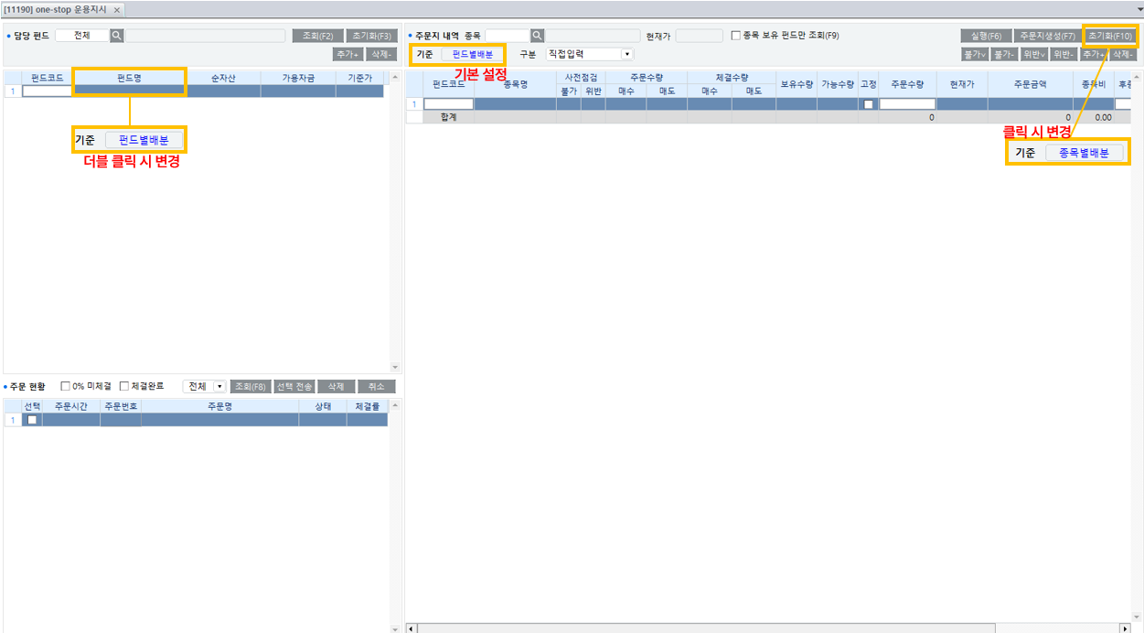 종목별 배분으로 변경 후에는 펀드 리스트에서 펀드명 더블 클릭 시 '펀드별배분'으로 변경 가능