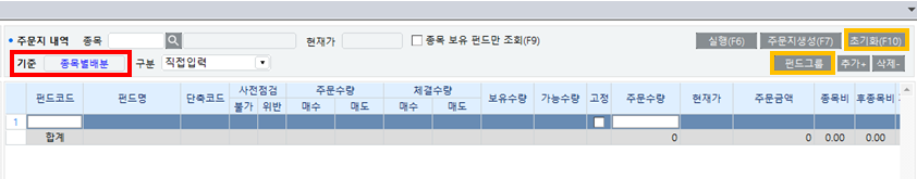 화면 가장 오른쪽 상단의 [초기화(F10)] 버튼을 클릭하거나, [펀드그룹] 버튼을 클릭하여 펀드를 선택하면 배분 기준이 '종목별배분'으로 변경되며, 아래 방법으로 주문지 생성이 가능합니다.