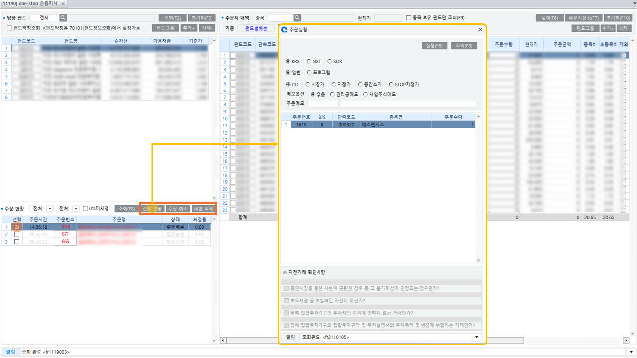 [선택전송] 버튼 클릭 > '주문실행' 팝업창에서 주문 옵션 (선택 클릭) & 메모 입력 > [실행(F6)] 클릭
