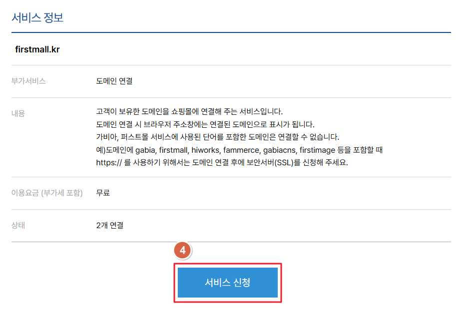 신규 도메인 연결을 위해서 '서비스 신청' 버튼을 클릭