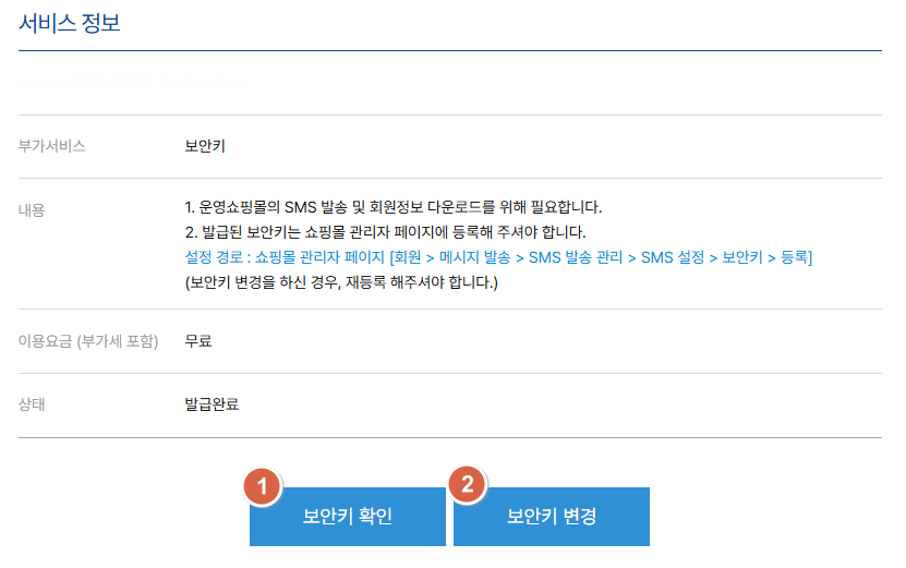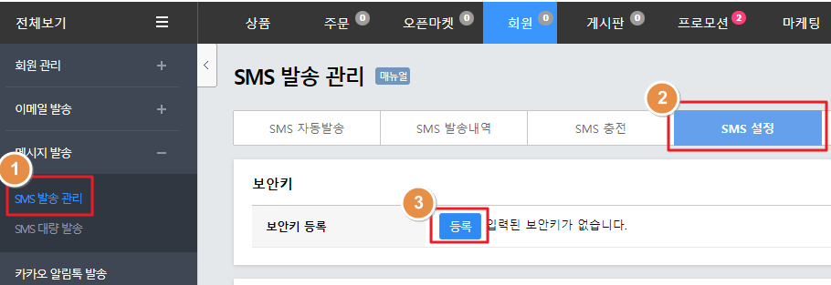 SMS 설정 화면에서 보안키를 등록해 주셔야 SMS 발송이 가능합니다.
