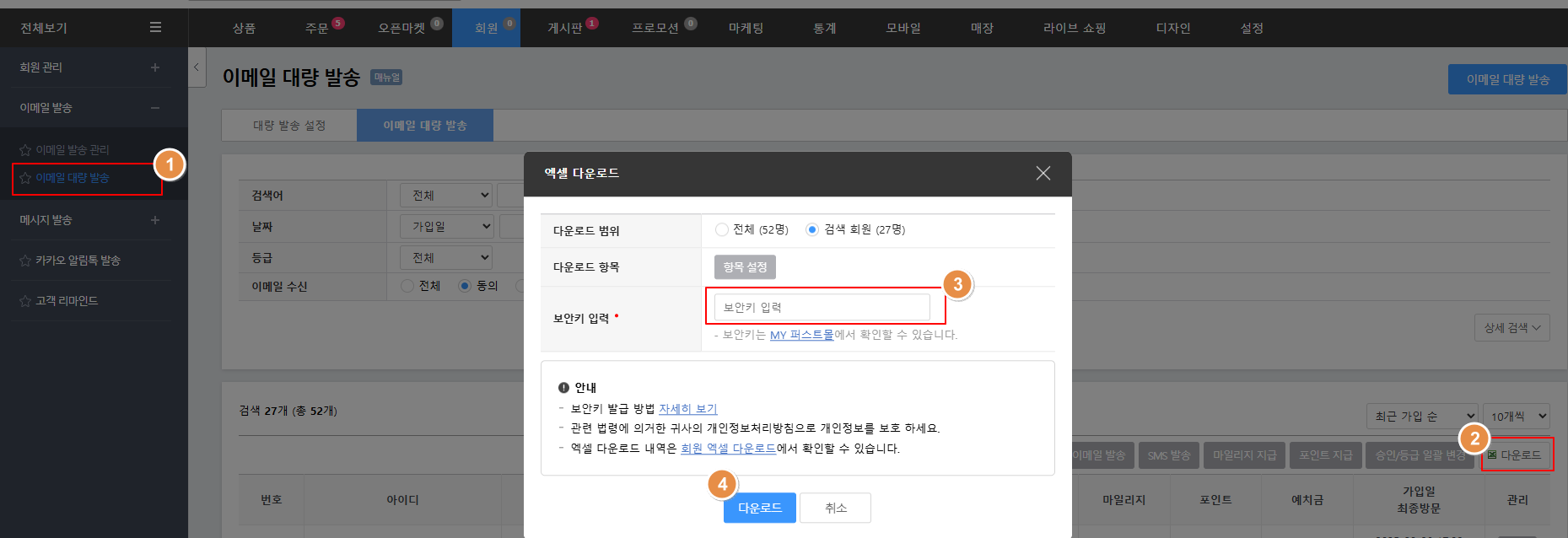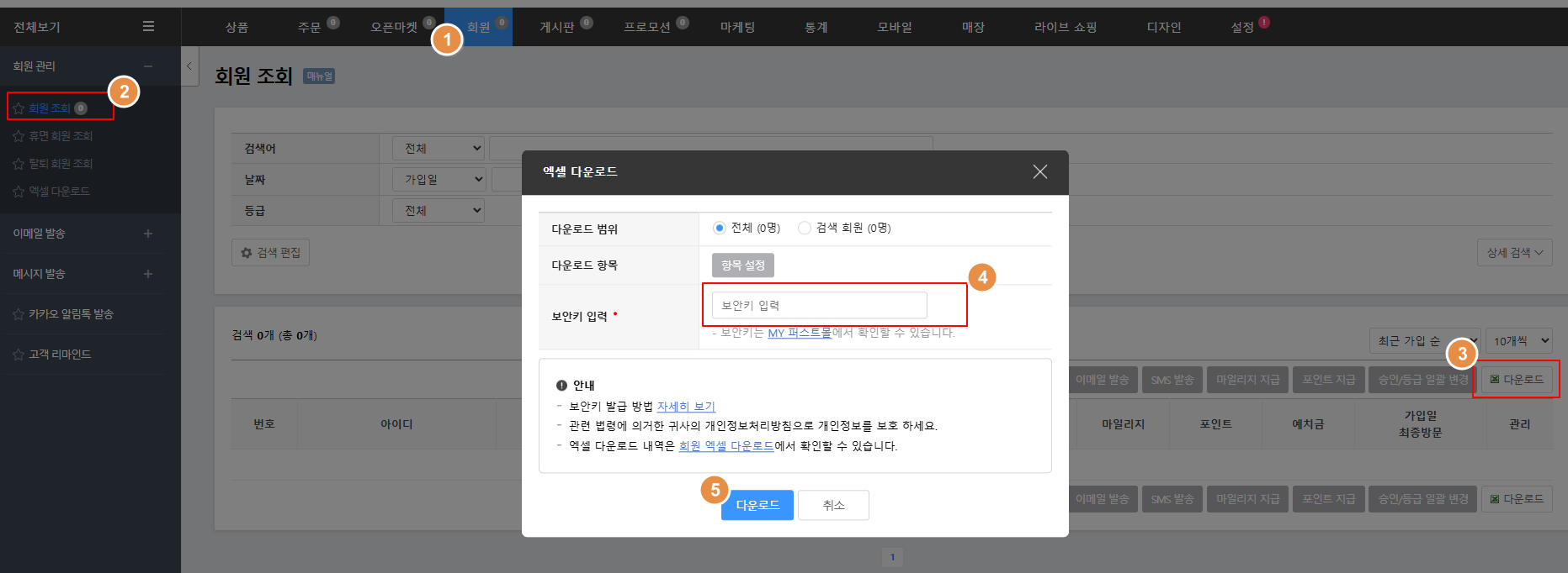 쇼핑몰에 가입된 회원 정보를 다운로드하려면 보안키 입력이 필요합니다.