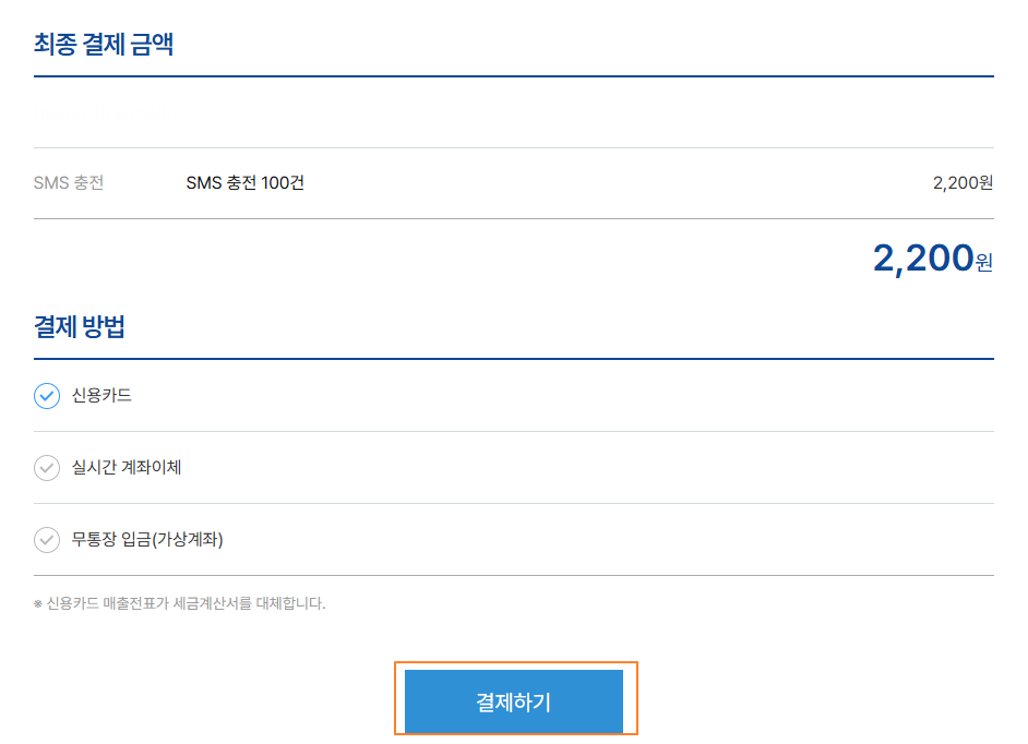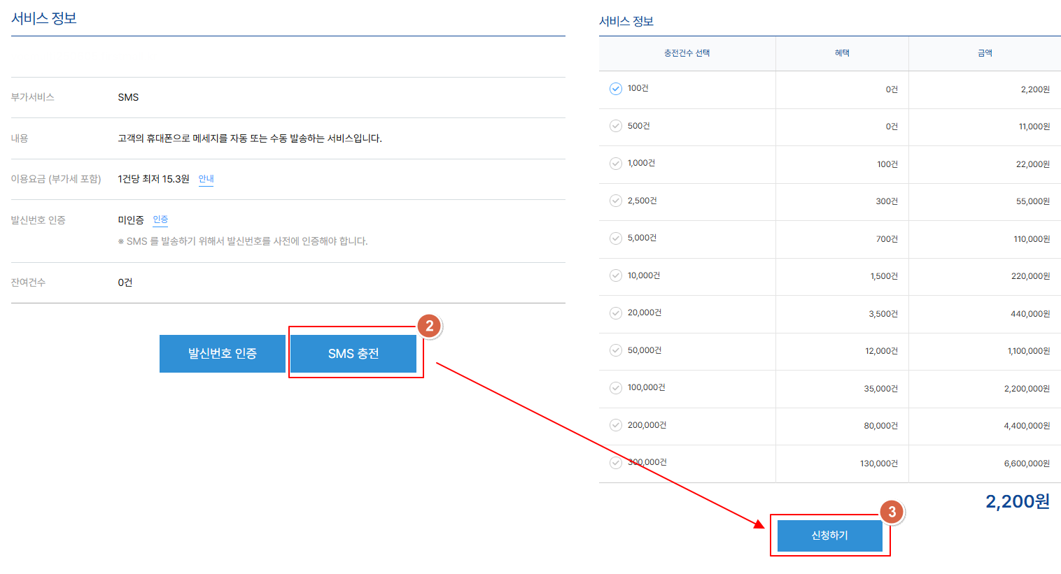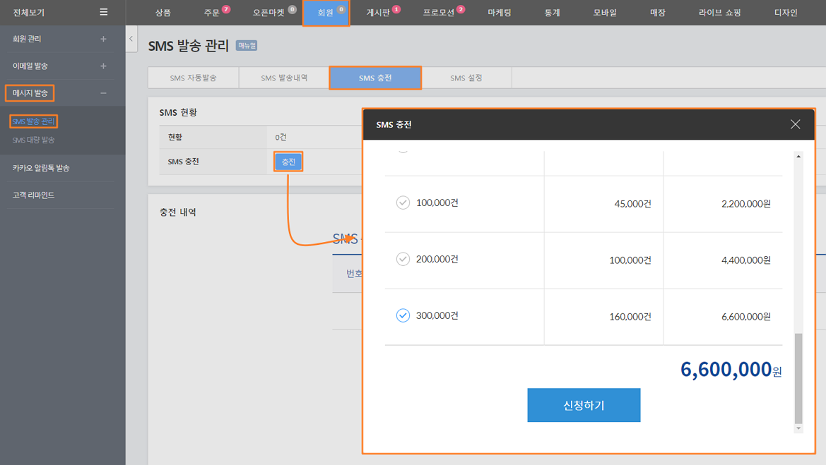 SMS 충전 금액 확인, 선택 후 [신청하기]를 클릭 합니다.