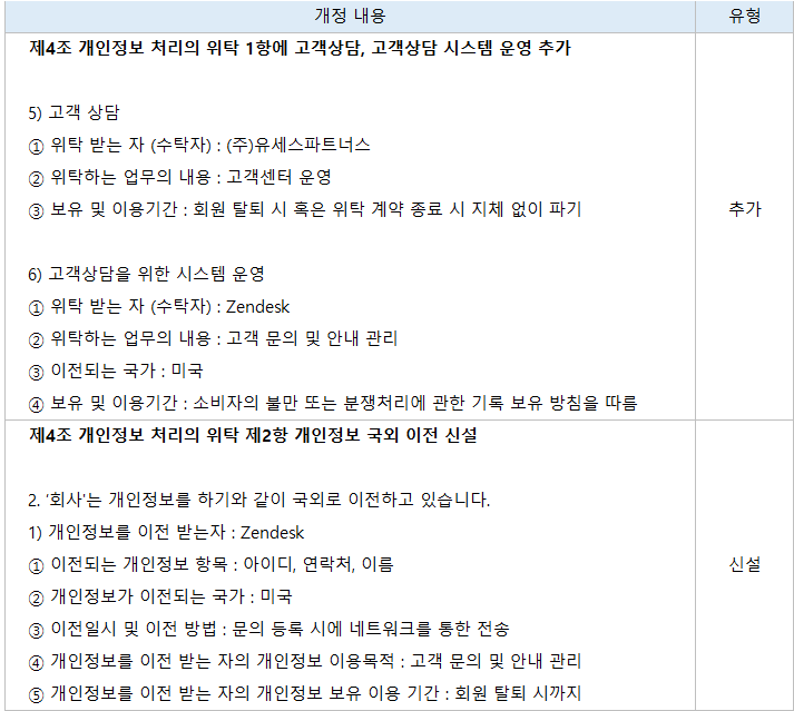 고객서비스 품질 향상을 위한 Zendesk 도입에 따른 고객 정보 해외 이전 추가