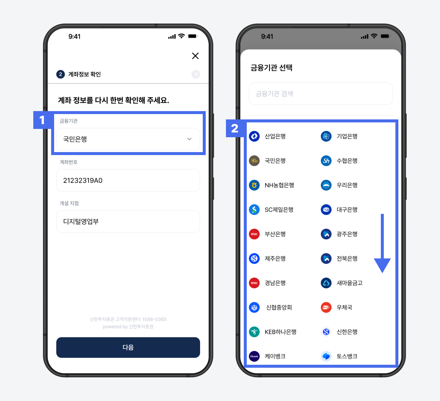 2) 아래로 스크롤 하여, 이전할 연금저축의 금융기관 선택