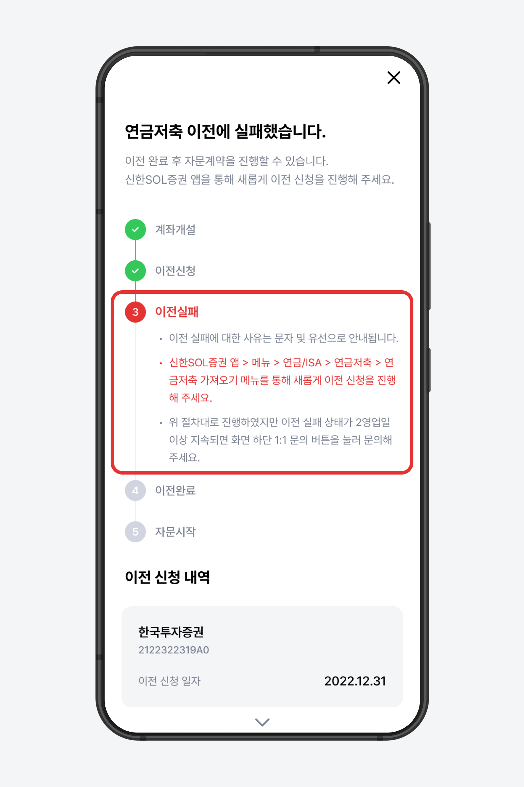 계좌 이전이 실패한 경우, 아래 두 가지 방법 중 선택해 진행할 수 있습니다.