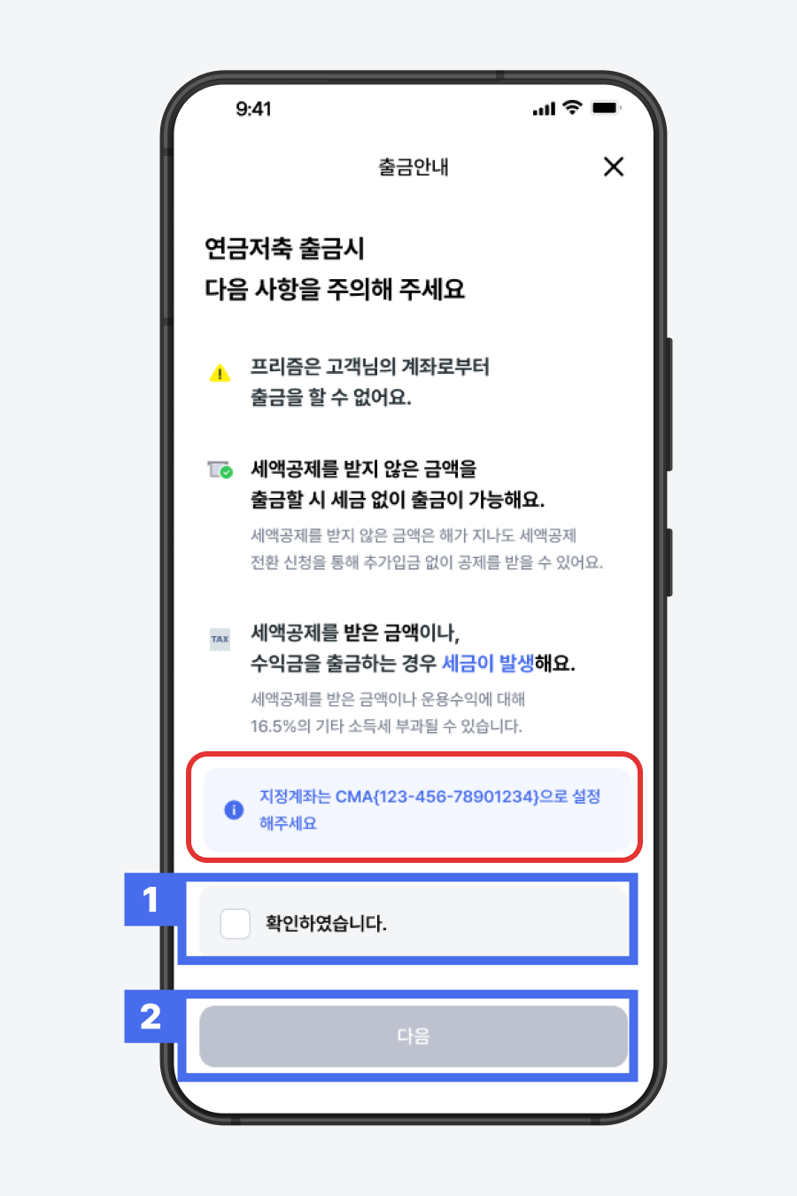 1) 연금저축 출금 안내 확인 > ‘확인하였습니다.’ 체크박스 클릭
