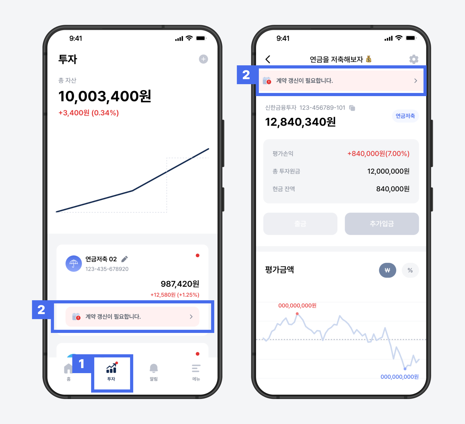 1) 프리즘 앱 하단의 ‘투자’ 탭을 클릭해 주세요. 투자 현황 화면에서 자문계약 갱신 안내를 확인할 수 있습니다.