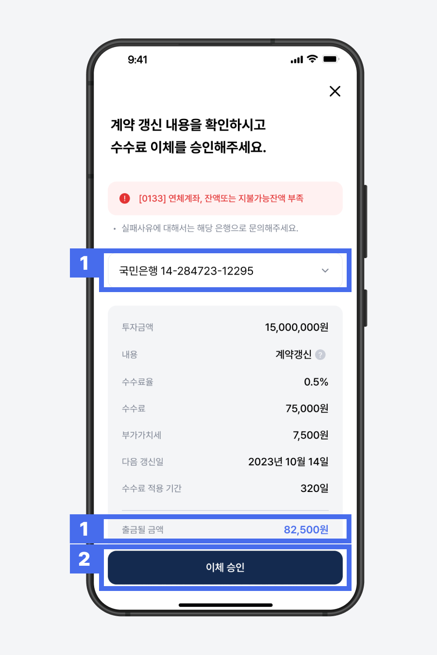 1) 수수료 납입 계좌번호를 확인한 후, 출금될 금액만큼의 잔고가 있는지 확인해 주세요.