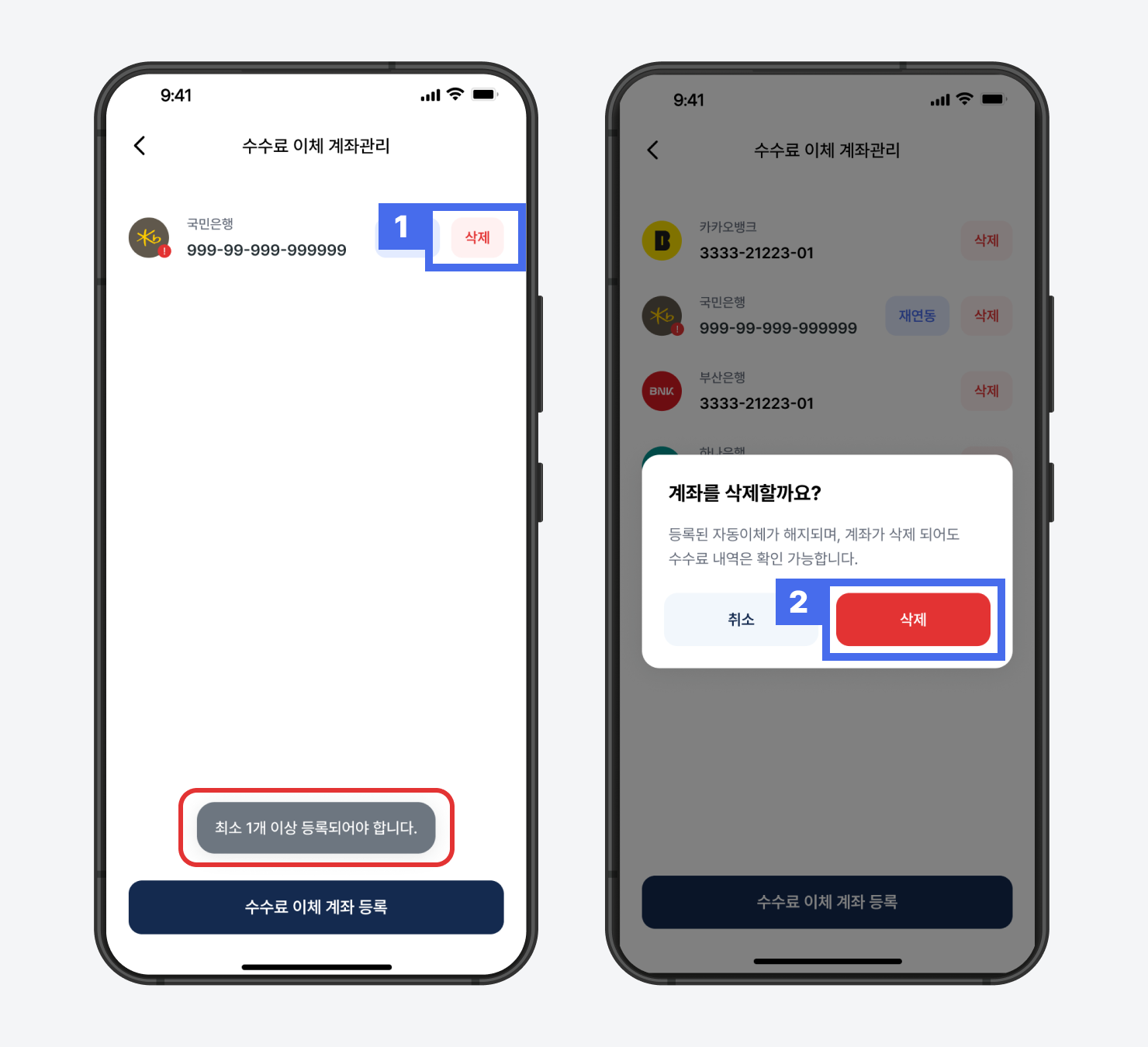 계좌가 하나만 남은 상태에서는 삭제가 되지 않으니 유의해 주세요.