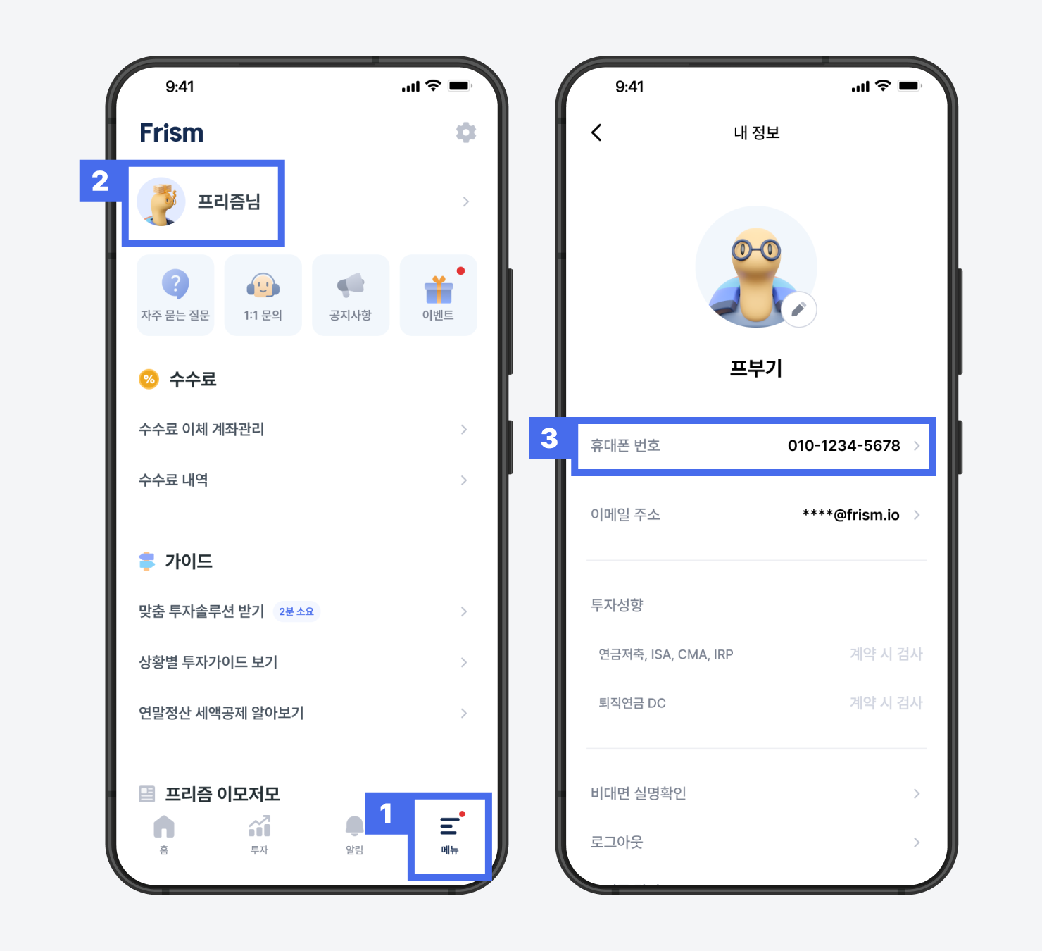 3) ‘휴대폰 번호’를 클릭한 뒤, 본인인증(문자인증 또는 PASS 앱 인증)을 완료하면 휴대폰 번호를 변경할 수 있습니다.