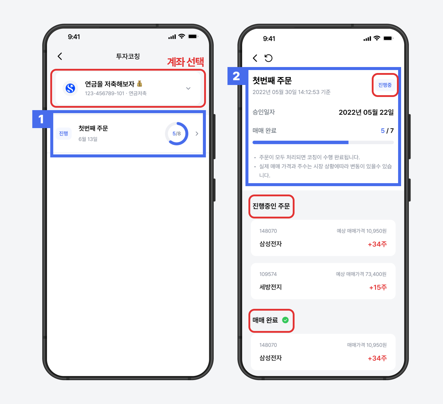 프리즘 앱 > ‘투자’ 탭 > 주문을 신청한 계좌 선택 > 화면을 아래로 스크롤 > ‘투자코칭' 클릭
