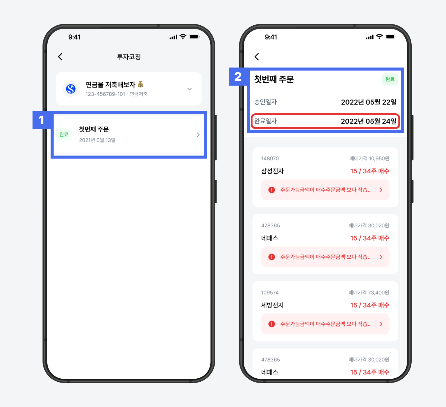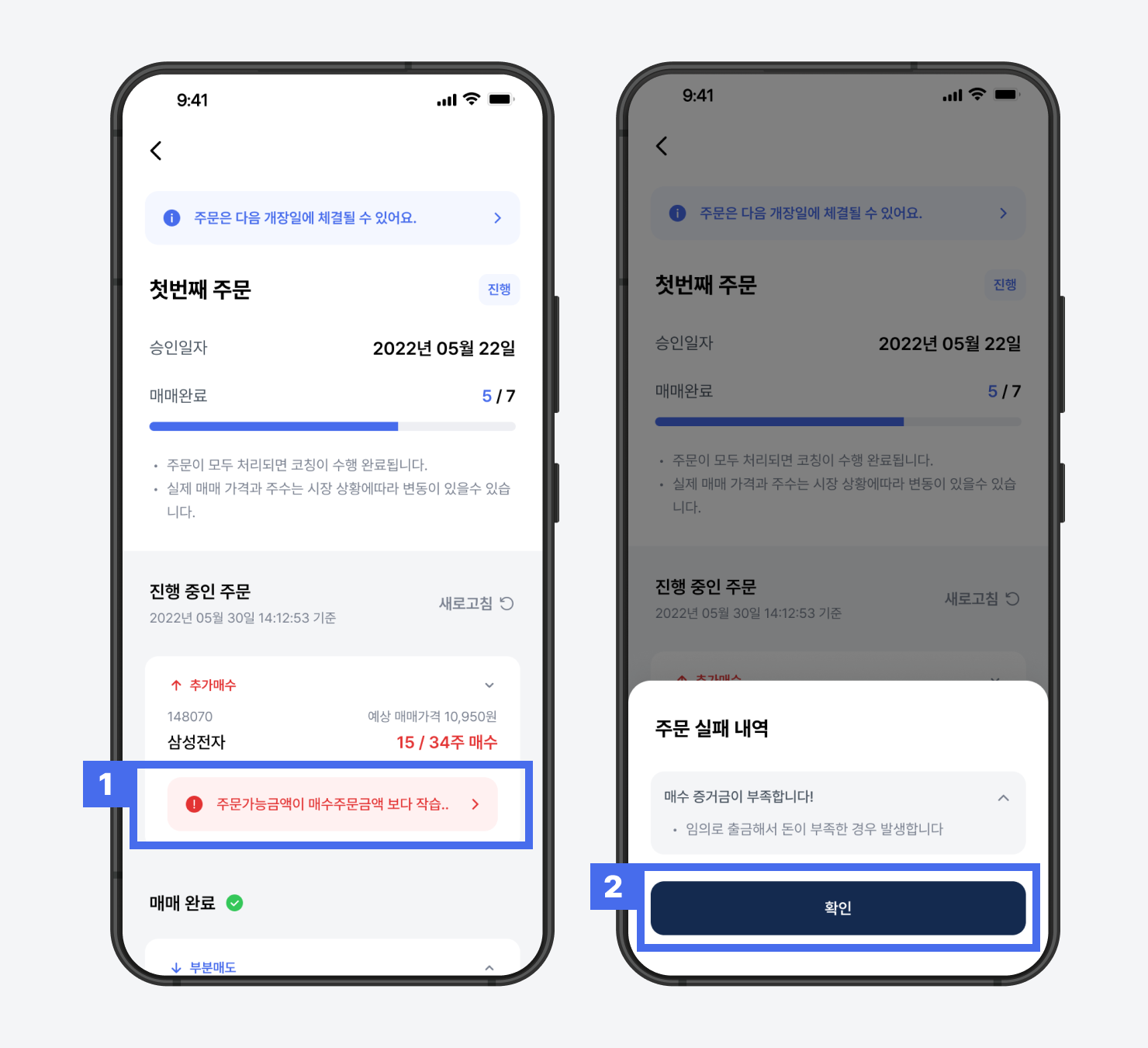 주문 상세 화면에서 ‘주문 실패’ 안내가 표시될 수 있습니다. 프리즘은 예약주문 방식으로 매매가 진행되기 때문에, 주문 시점과 실제 체결 시점의 가격 차이로 인해 일부 수량이 매매에 실패하는 경우가 발생할 수 있습니다. (투자 금액, 코칭 종류 등에 따라 발생 여부는 다를 수 있습니다.)