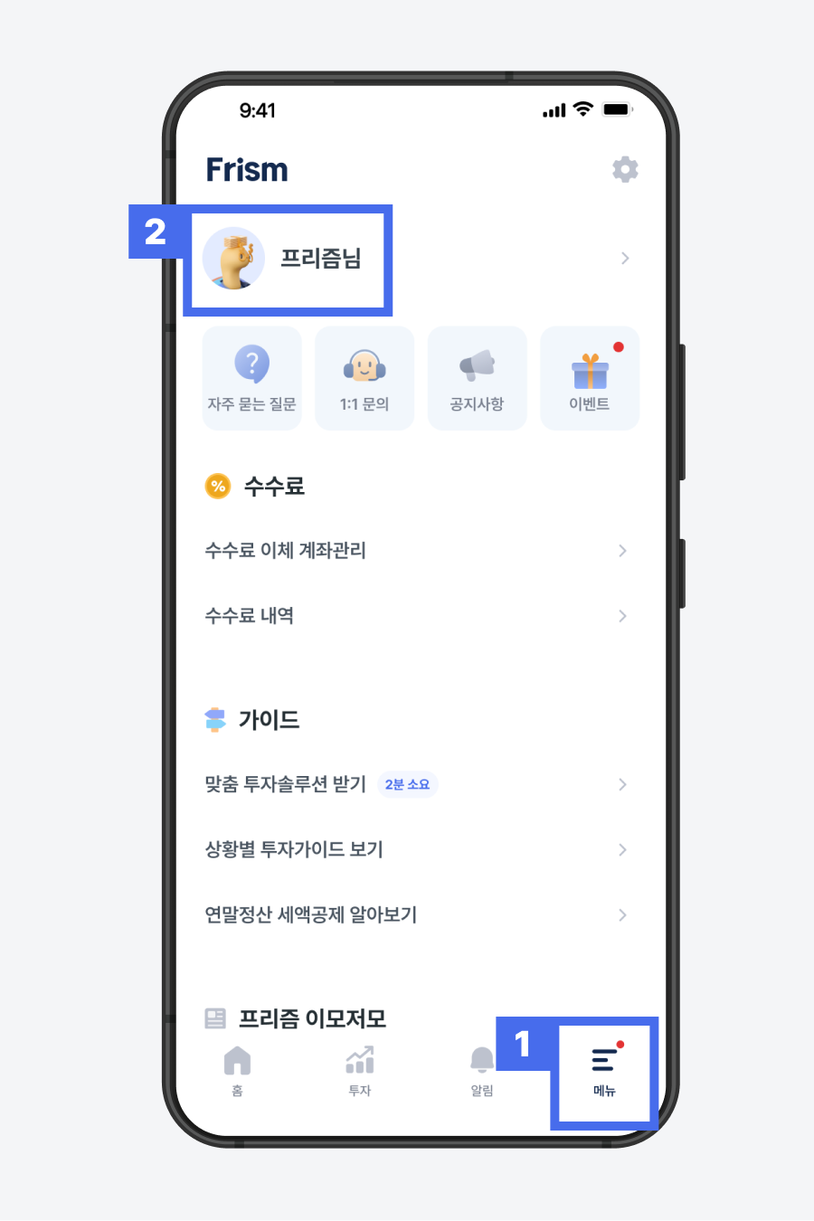 1) 프리즘 앱 하단의 ‘메뉴’ 탭을 클릭합니다.