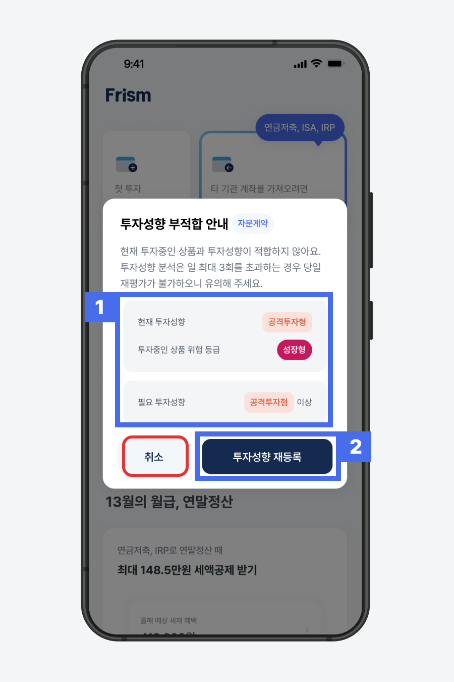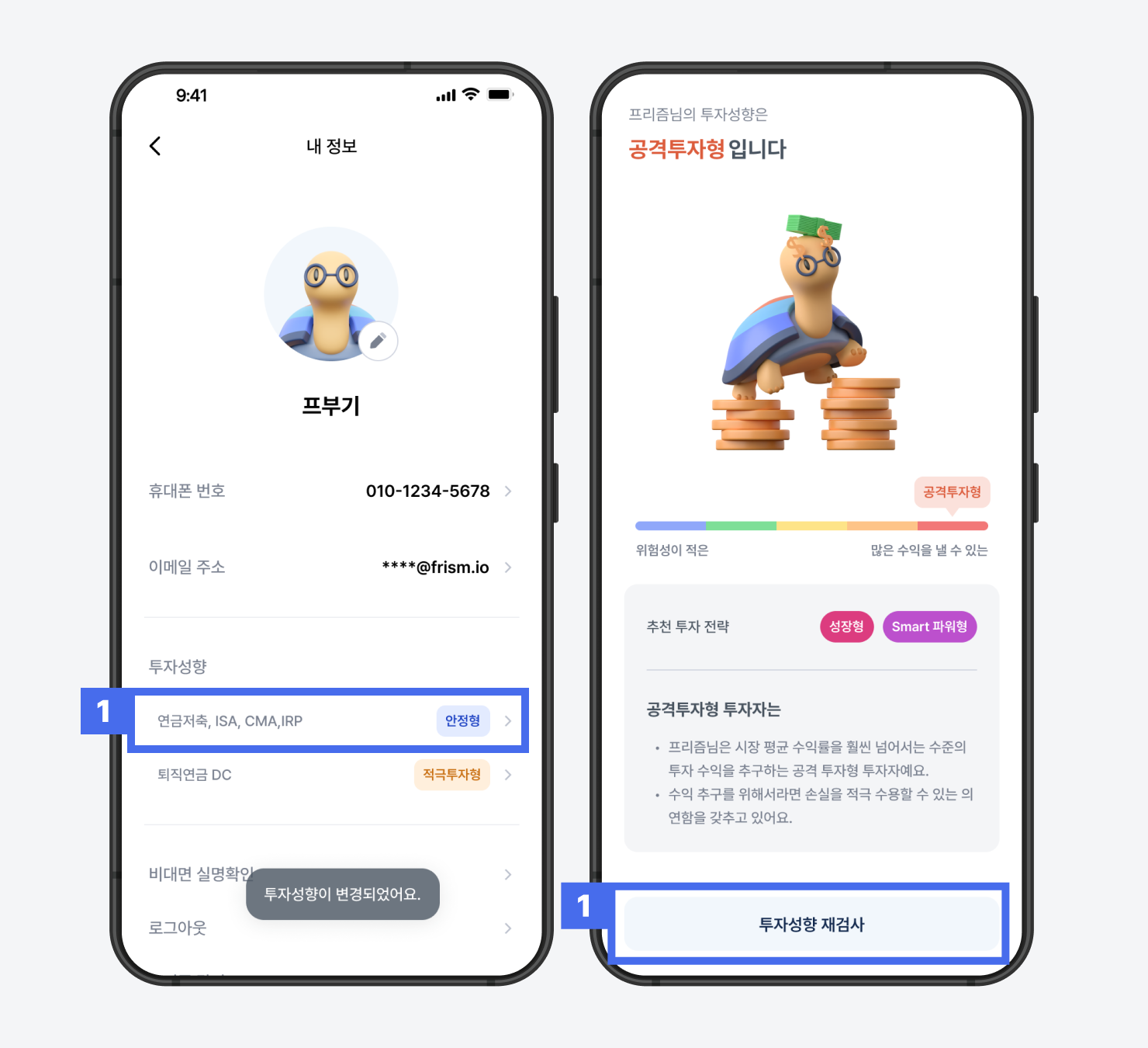 프리즘 앱 하단 네 번째 아이콘(메뉴) > 고객님 이름 클릭 > 투자성향 클릭 > 재검사 경로를 통해 투자성향 재검사를 진행할 수 있습니다.