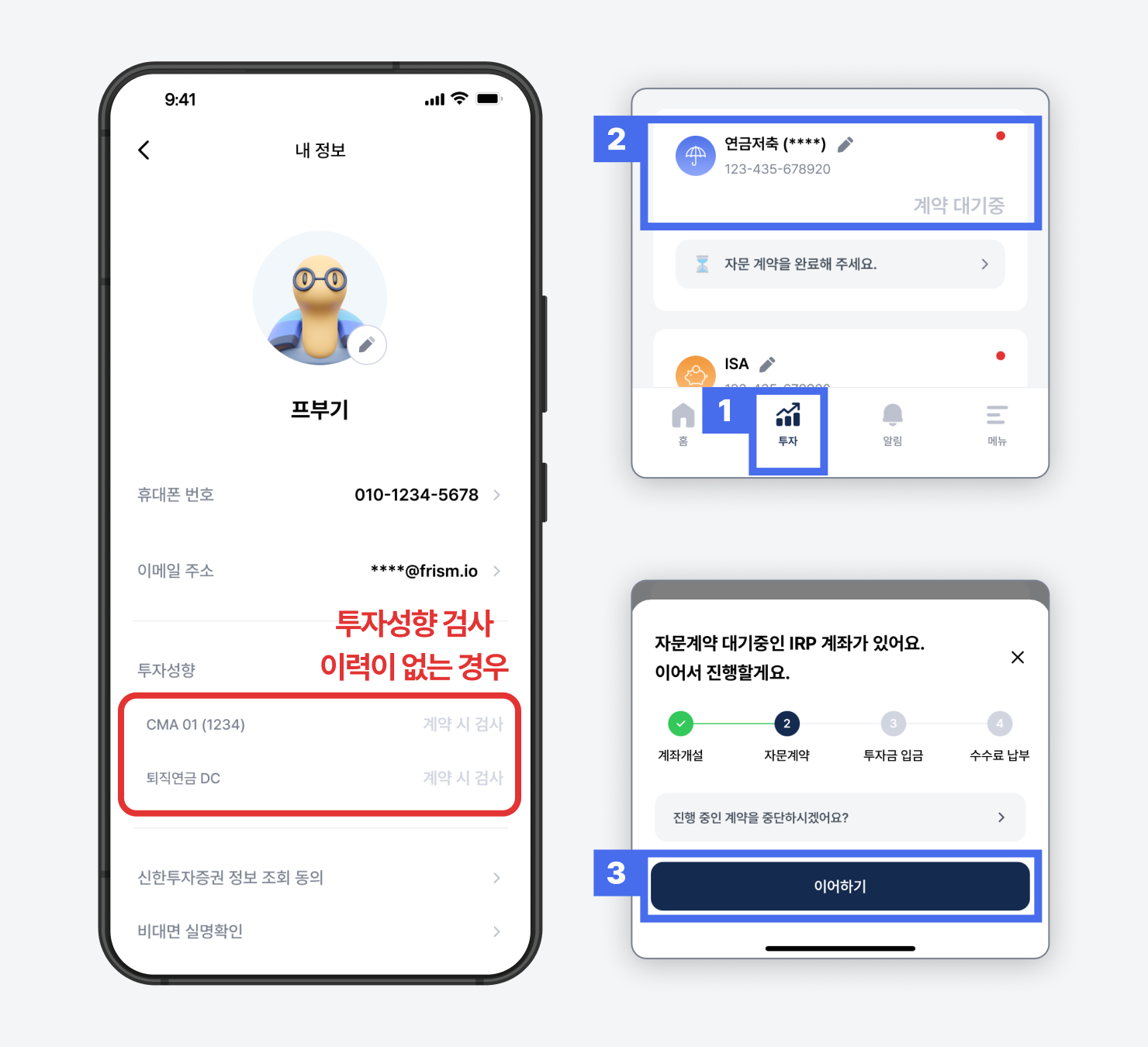 투자성향 검사를 아직 한 번도 진행하지 않은 경우에는, 자문계약을 진행하는 과정에서 첫 투자성향 검사를 하게 됩니다.