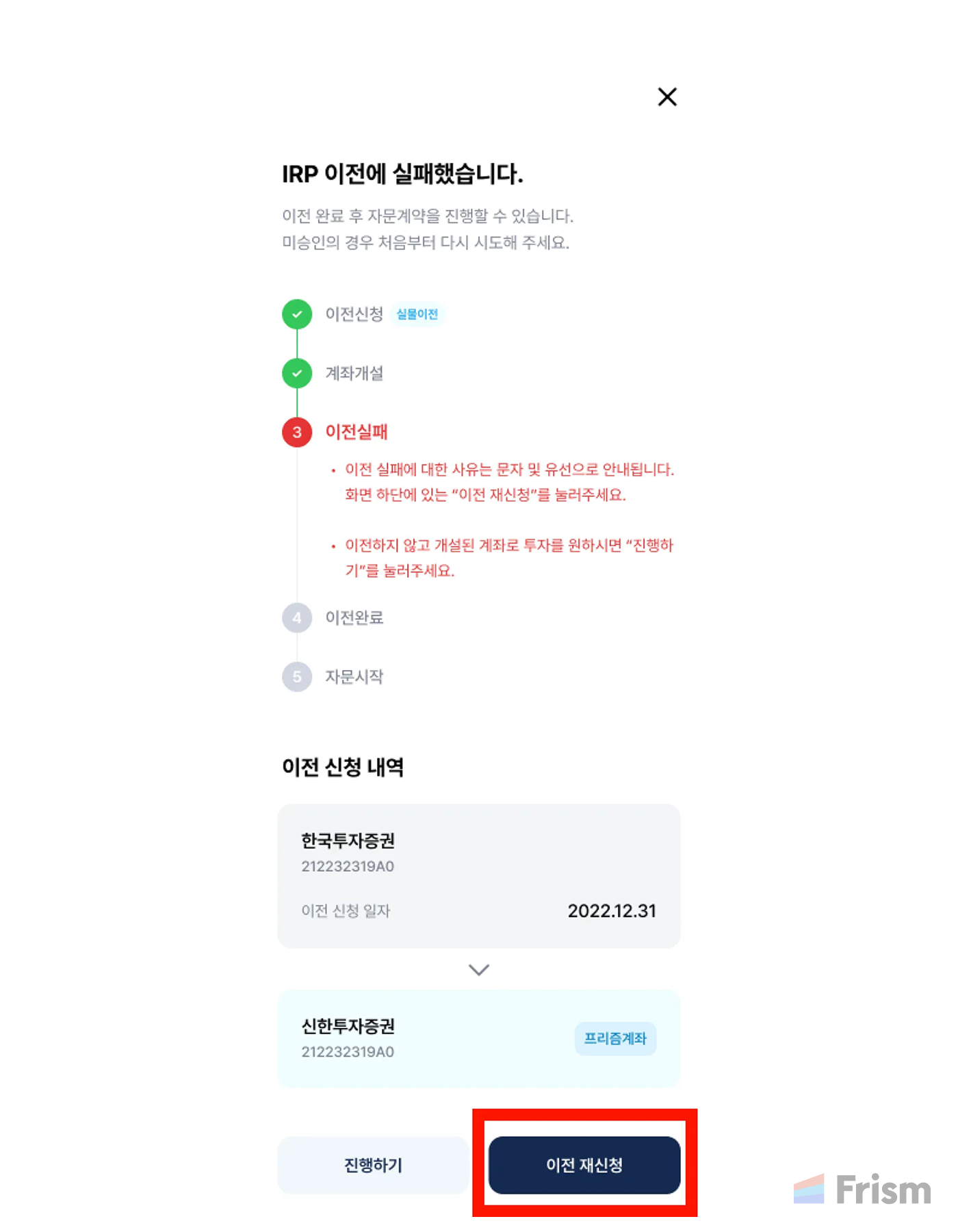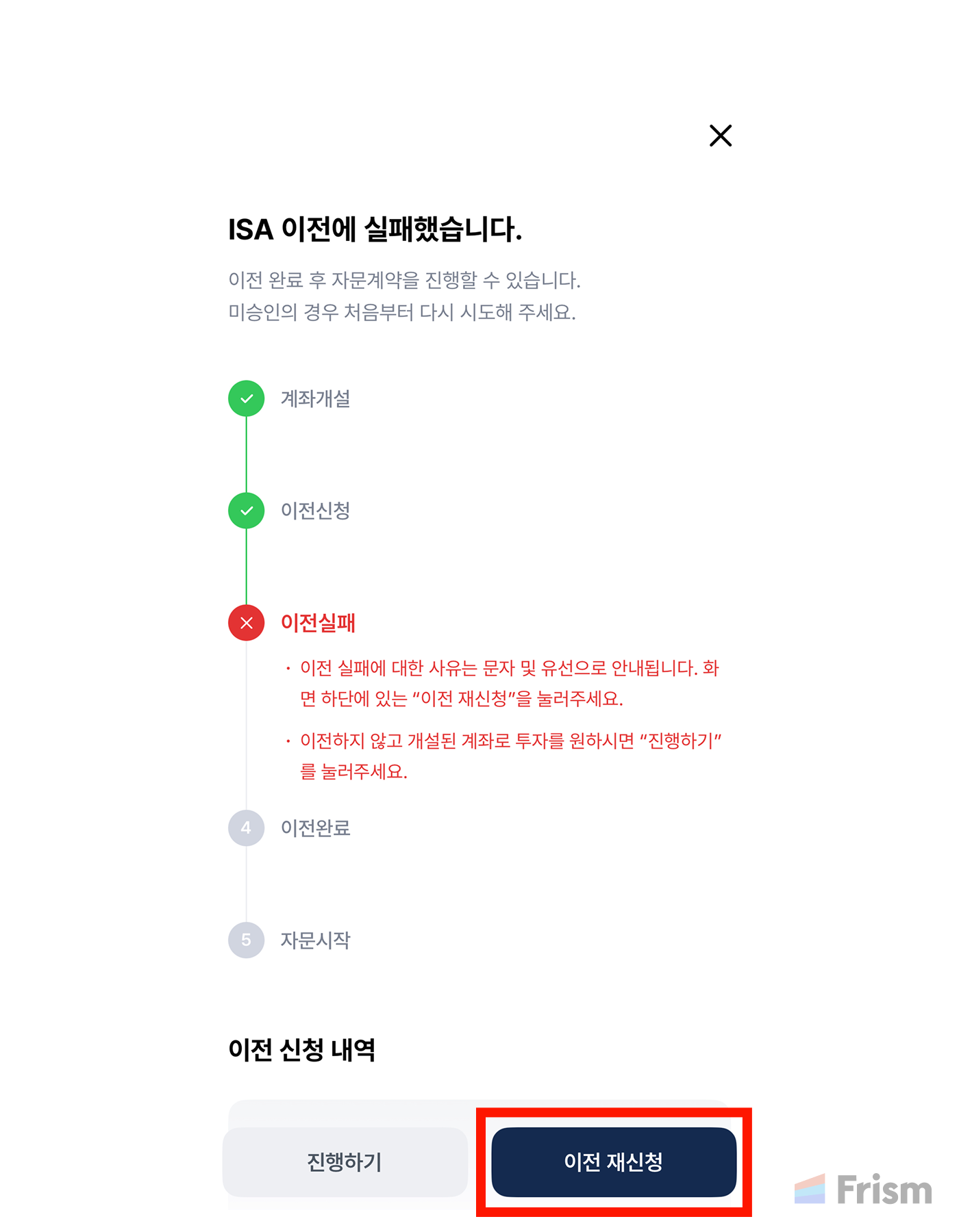 프리즘 앱 > '이전 실패' 상태의 ISA 계좌를 선택 > ‘다시 시도’ 버튼을 눌러 재신청 절차 진행 부탁드립니다.