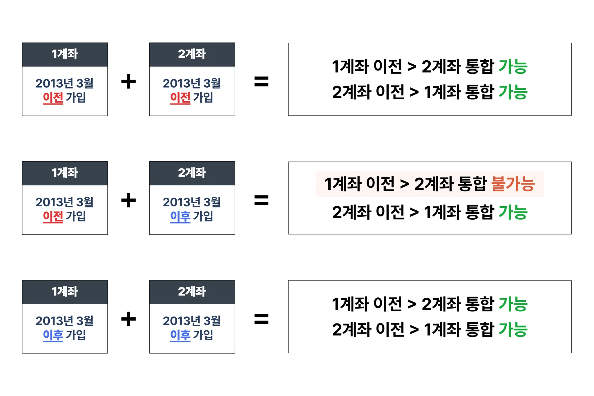 2013년 3월 1일 이전 계좌와 이후 계좌를 통합하는 경우