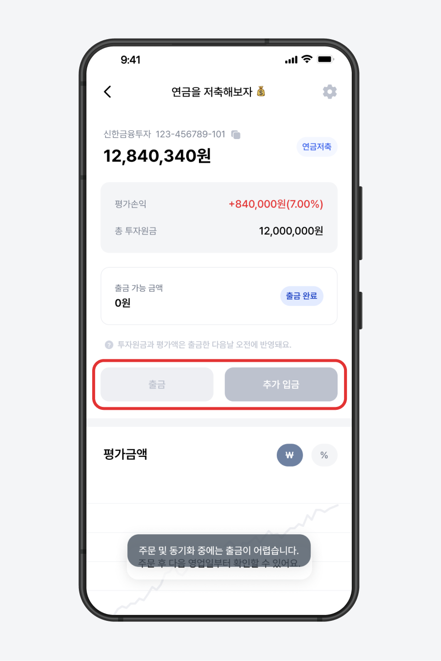 프리즘은 중복 주문을 방지하기 위해 ’매매 진행 → 매매 완료 → 동기화’ 과정이 모두 끝나기 전까지 추가입금이 제한됩니다.매매와 동기화가 완료되면 추가입금 버튼은 자동으로 활성화되며, 입출금 내역과 매매 내역을 확인할 수 있습니다.매매 완료 후 동기화까지는 1영업일이 소요될 수 있습니다.