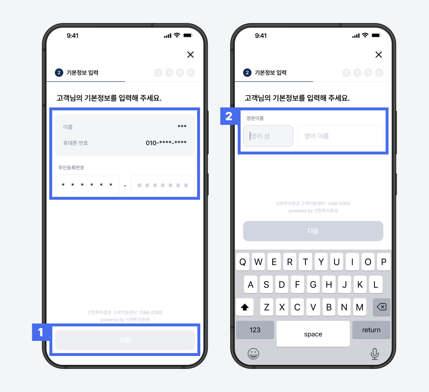 1) 이름, 휴대폰 번호, 주민등록번호 입력 *이름 및 휴대폰 번호는 자동으로 입력됩니다.