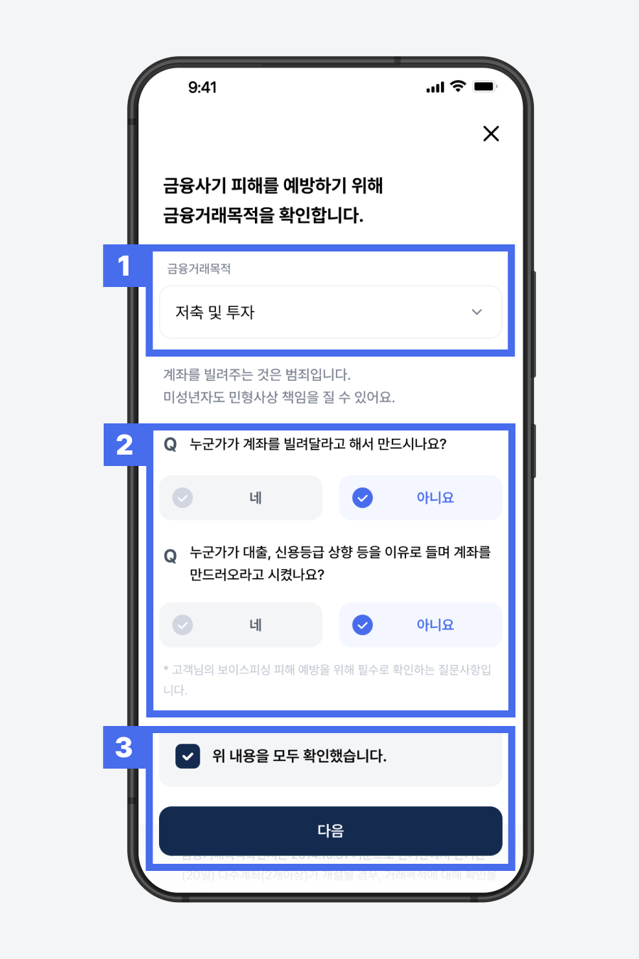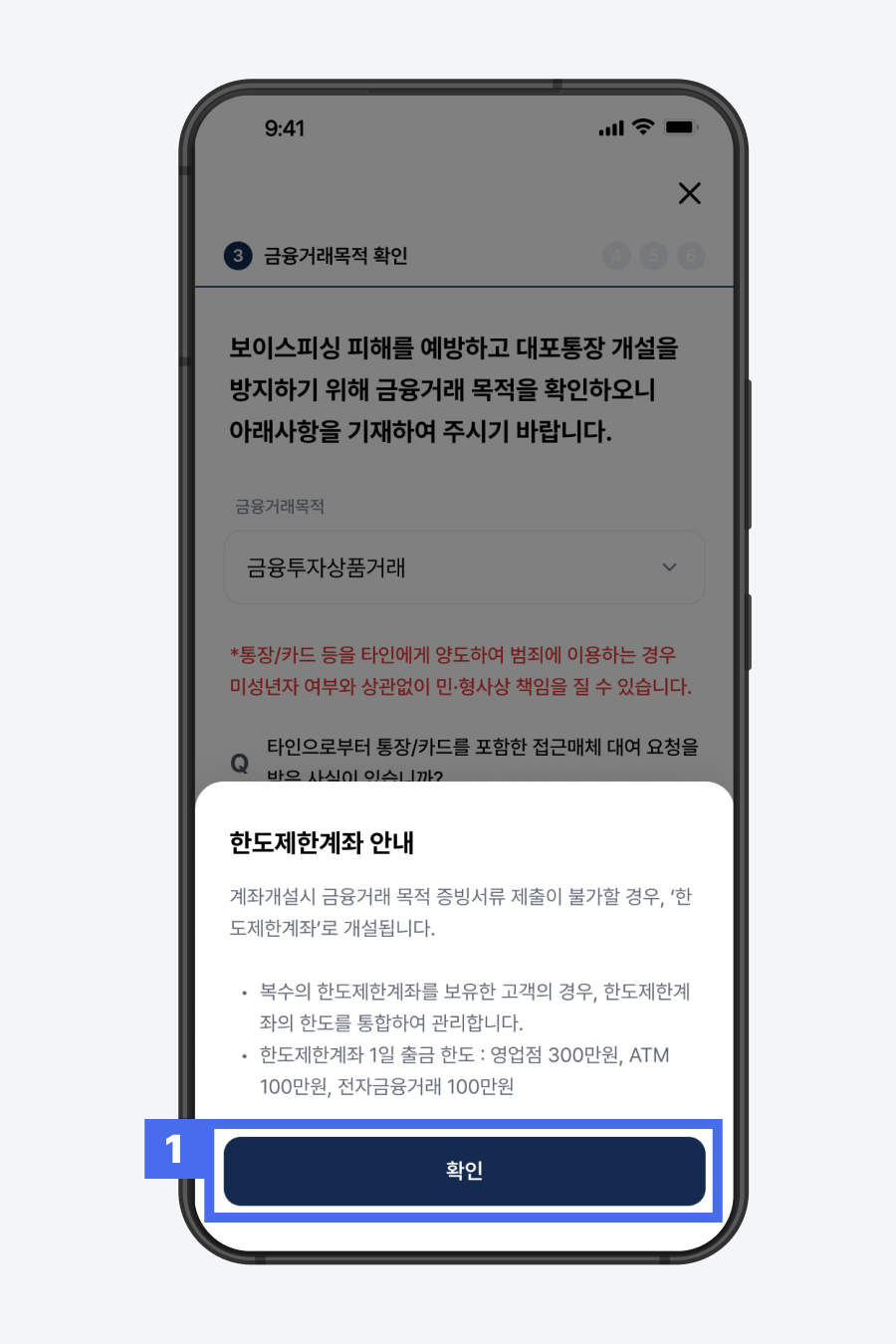 금융사기 피해를 예방하기 위해 금융거래목적을 확인하고 있습니다.