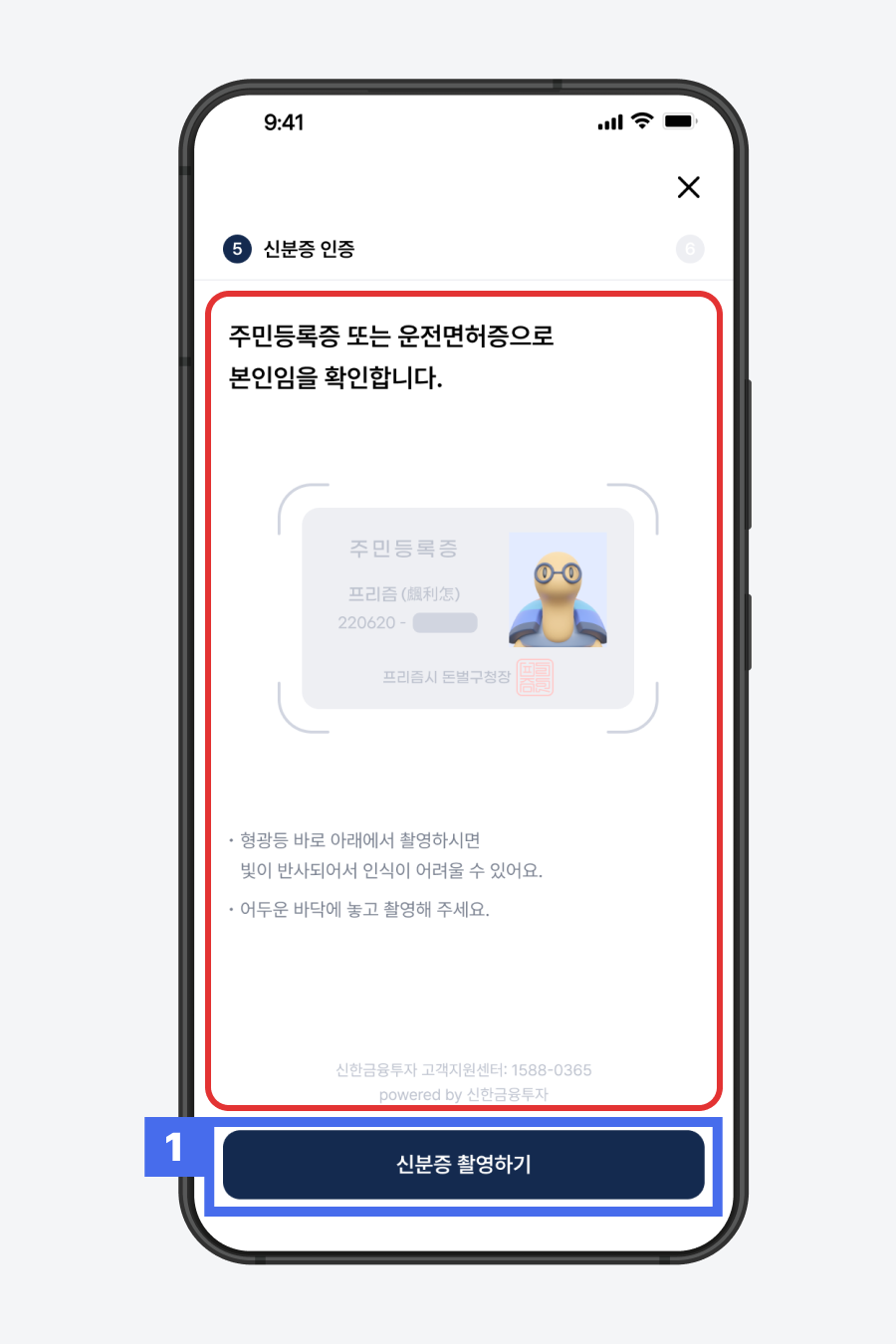 신분증 촬영 화면은 신한투자증권에서 제공하는 화면으로, 프리즘 앱에서 변경이 어렵습니다. 위 2가지 방법으로도 인증이 안되면 신한투자증권 고객센터로 문의해 주세요.