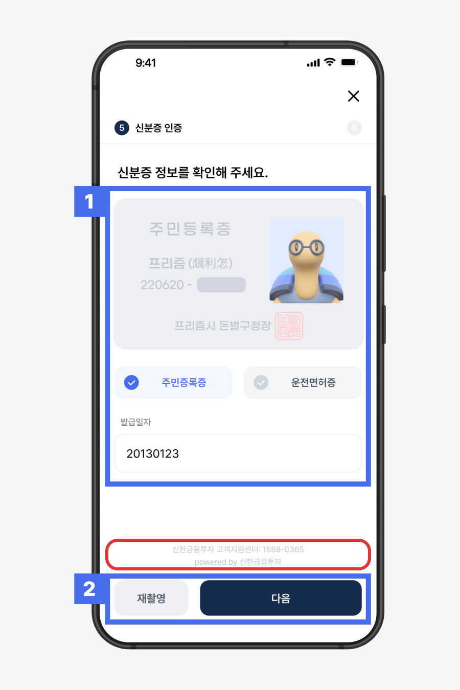 1) 촬영한 신분증 정보가 올바른지 확인 후, 신분증 정보가 올바르지 않다면 수정해 주세요.