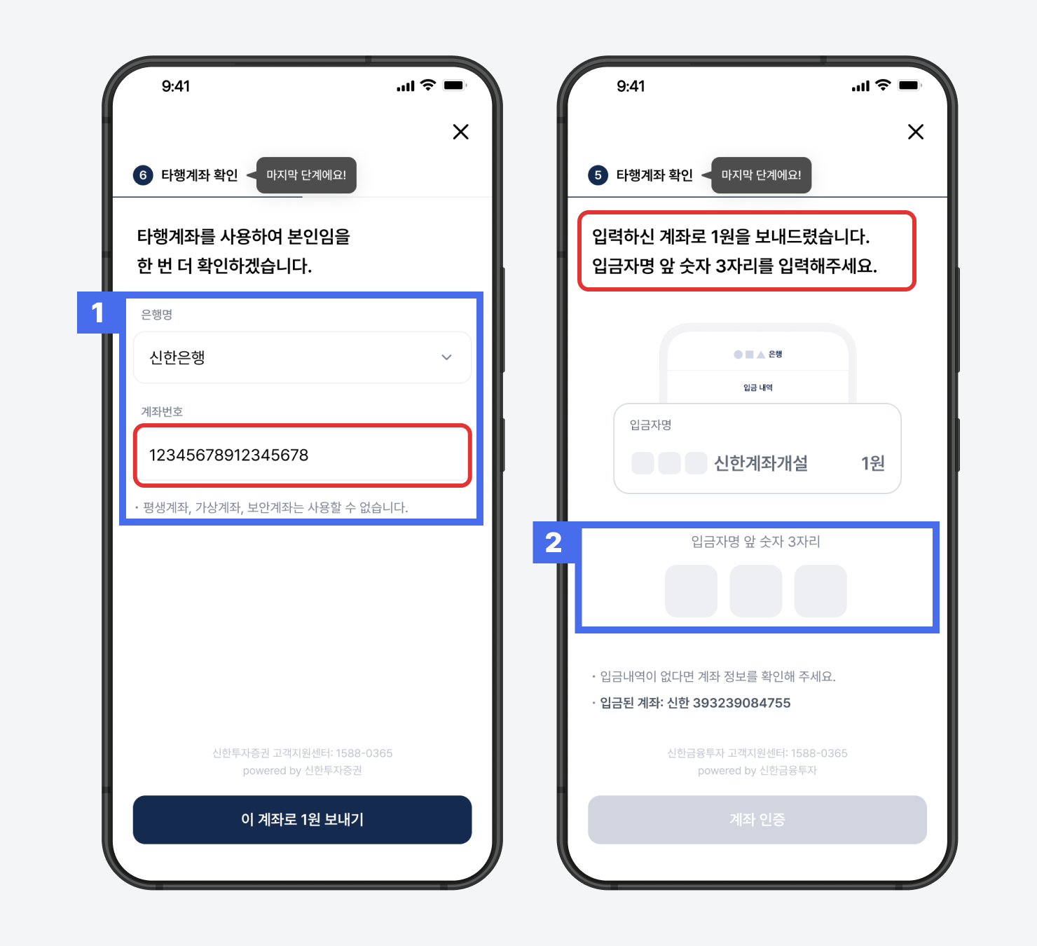 2) 입금된 1원의 입금자명 앞 숫자 3자리를 입력해주세요.