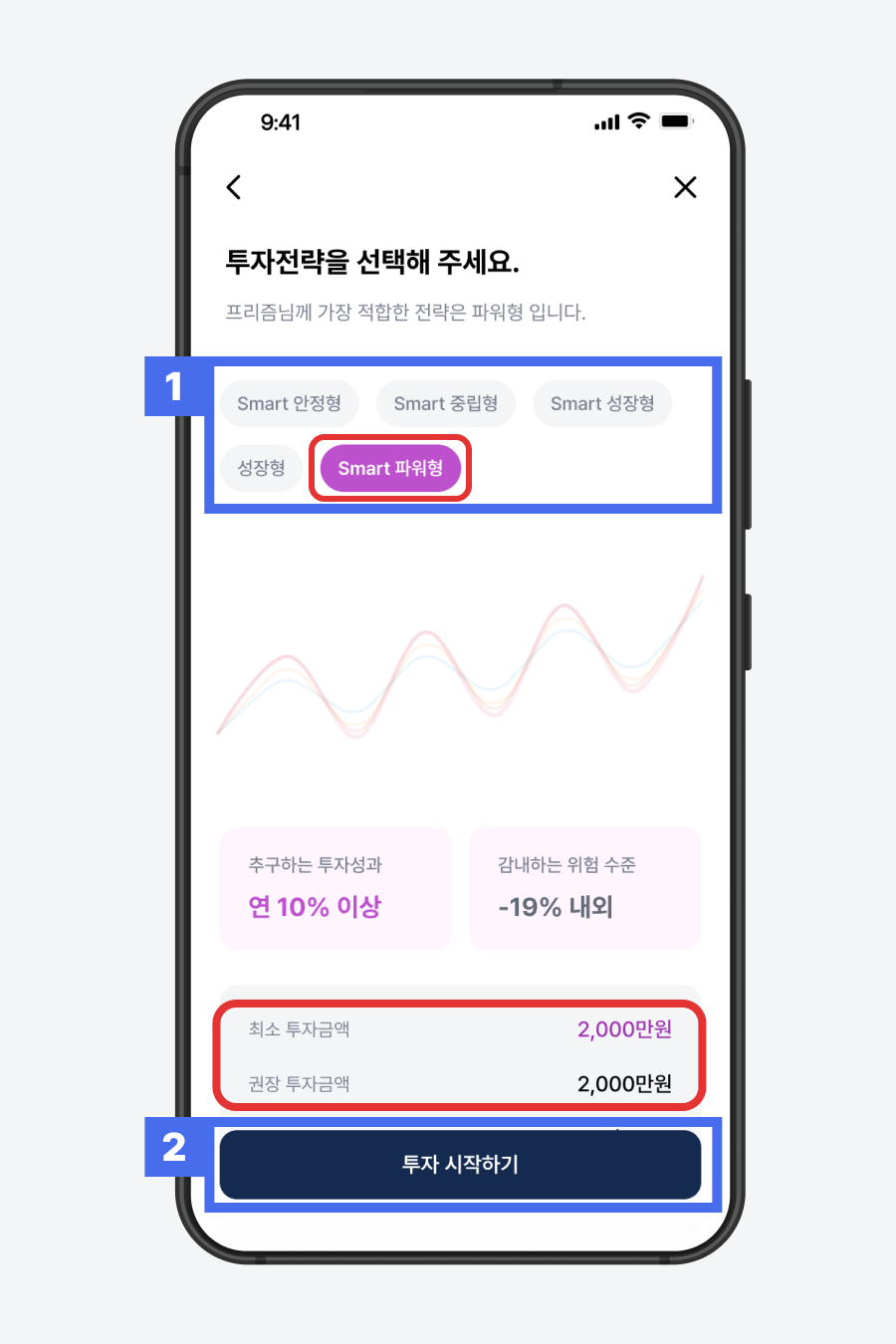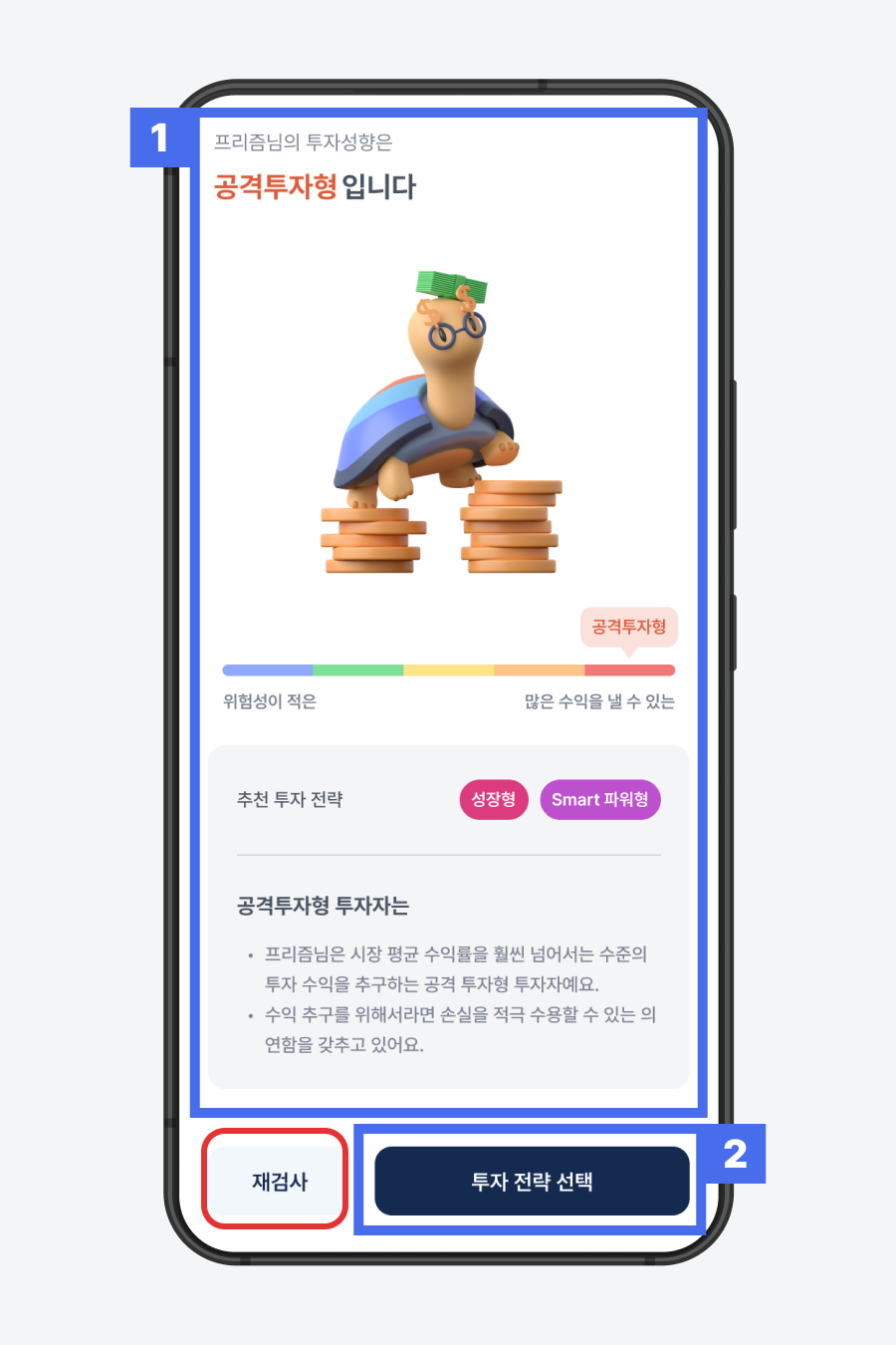 뒤로가기 버튼을 눌러 ‘투자전략 선택’ 화면으로 돌아가 주세요.
