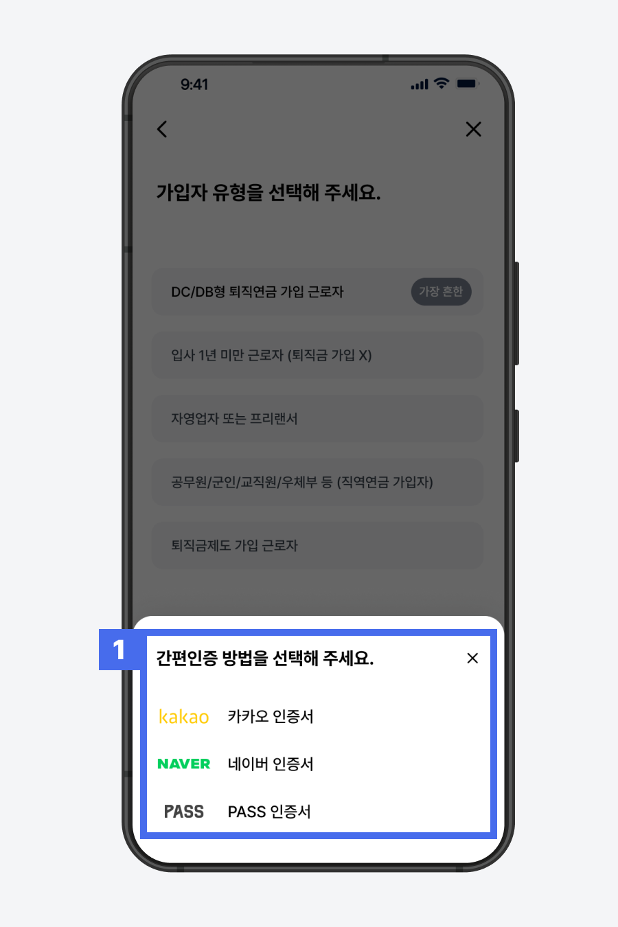 1) 카카오, 네이버, PASS 중 간편 인증을 진행할 방법 선택해주세요.