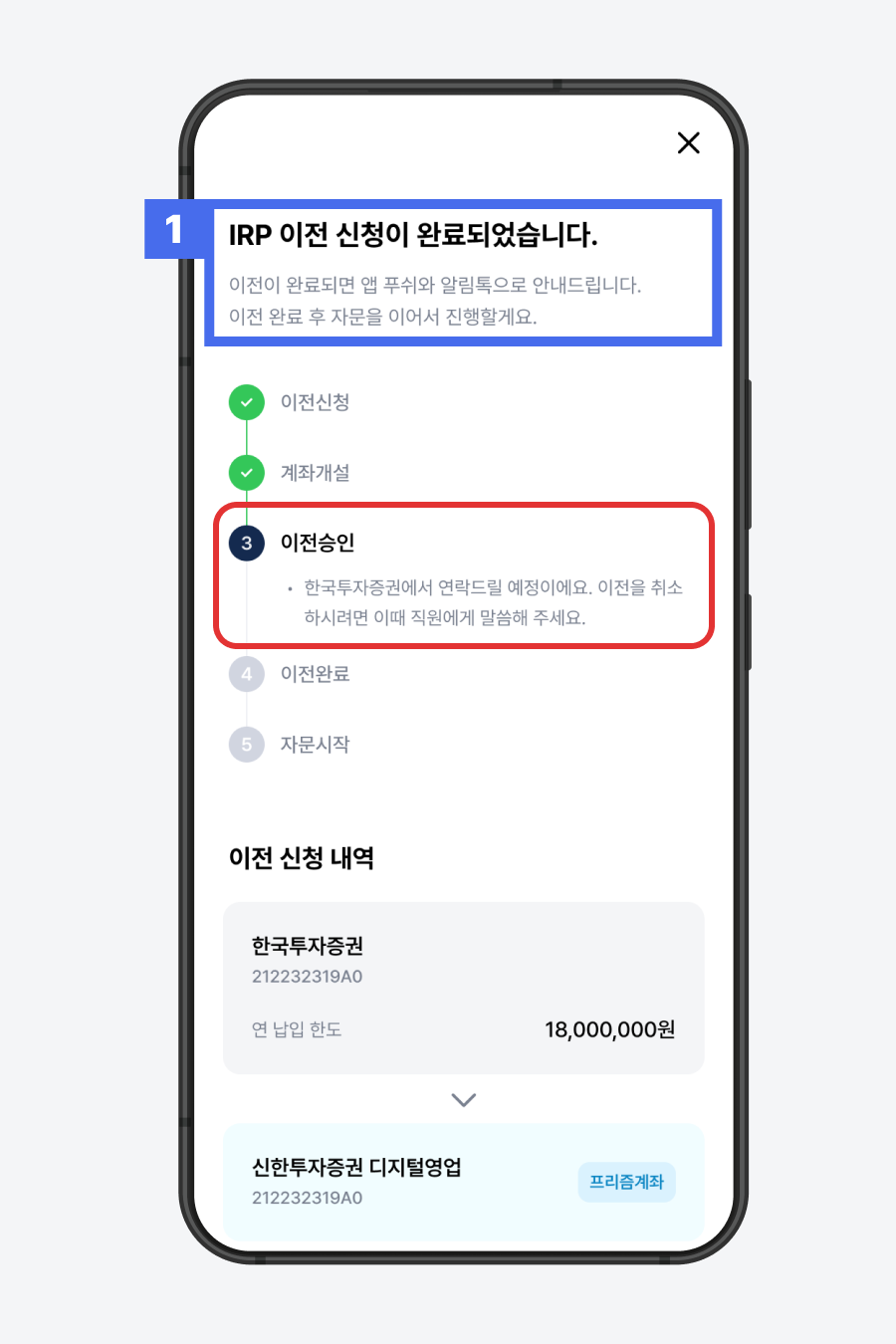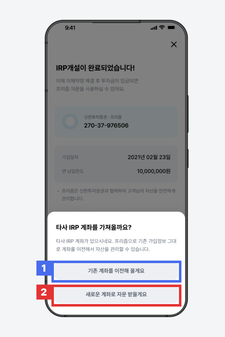 IRP 계좌는 각 금융사당 1개만 보유 가능합니다. 신한투자증권에 이미 IRP계좌가 있다면 바로 프리즘 앱으로 이전이 어렵습니다. 다음 두 가지 방법 중 하나를 선택하여 진행해주세요.