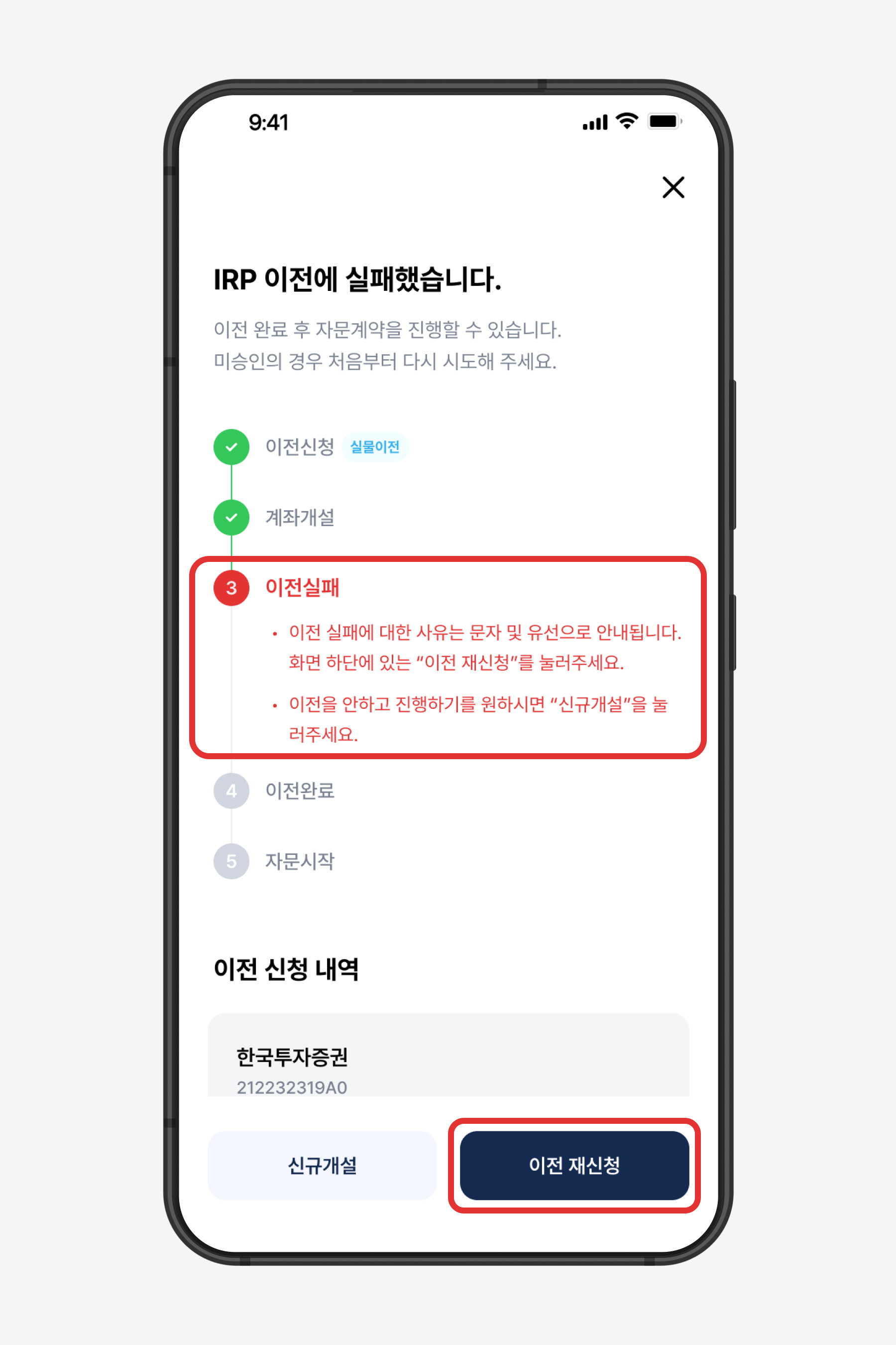 계좌 이전이 실패한 경우, 이전 실패 사유가 해소되면 이전 재신청이 가능합니다.